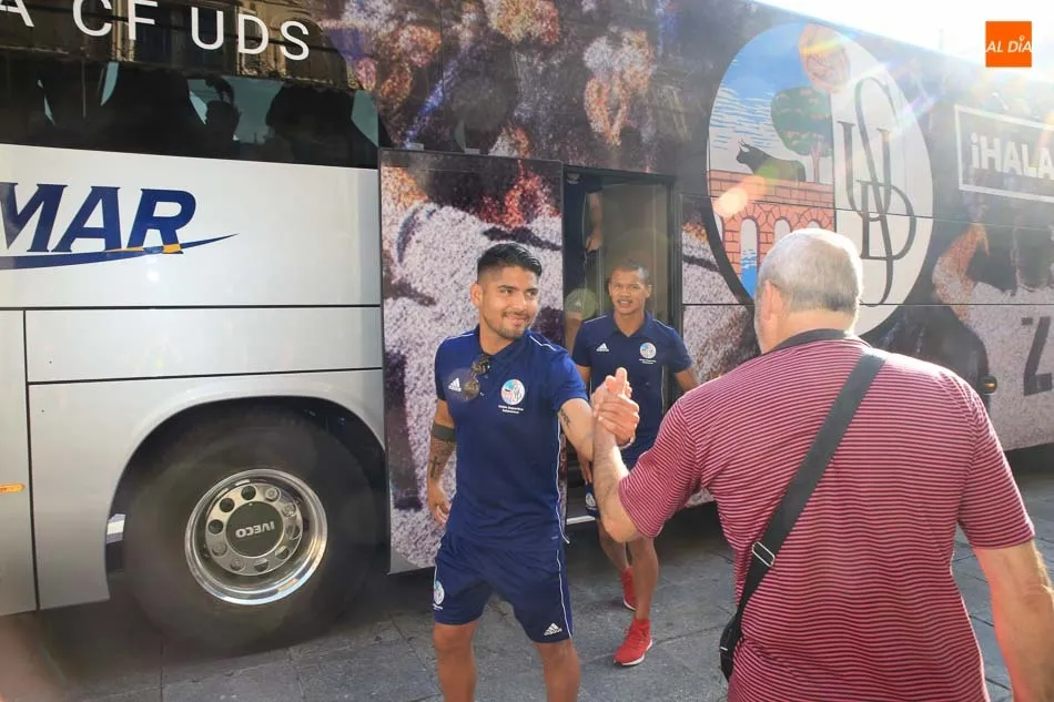 La plantilla se trasladó en el vehículo desde el Helmántico, escoltada por las fuerzas del orden y fueron aclamados en el ágora charra por algunos aficionados