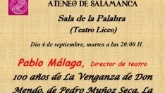 El próximo día 4 de septiembre, martes, el Ateneo de Salamanca inicia el nuevo curso, y lo hace en la Sala de la Palabra a las 20 horas con la conferencia: 100 años de La Venganza de Don Mendo, de Pedro Muñoz Seca. La importancia del teatro de humor que correrá a cargo de Pablo Málaga, Director de teatro. Un nutrido grupo de actores leerá una selección de fragmentos de ?La venganza de don Mendo?. La entrada es libre hasta completar el aforo.