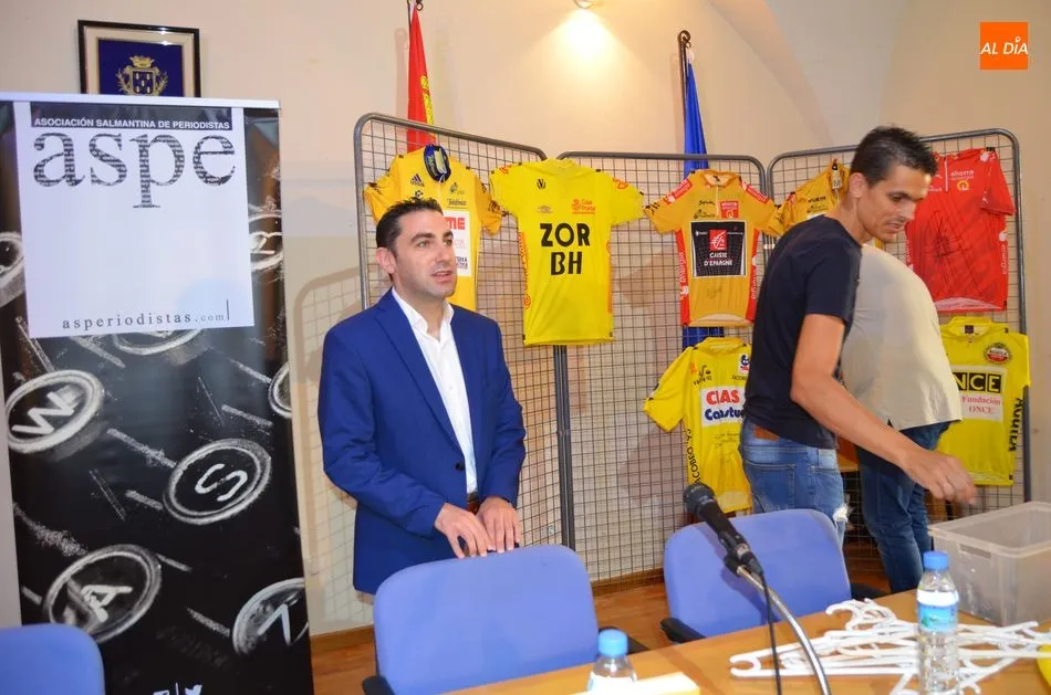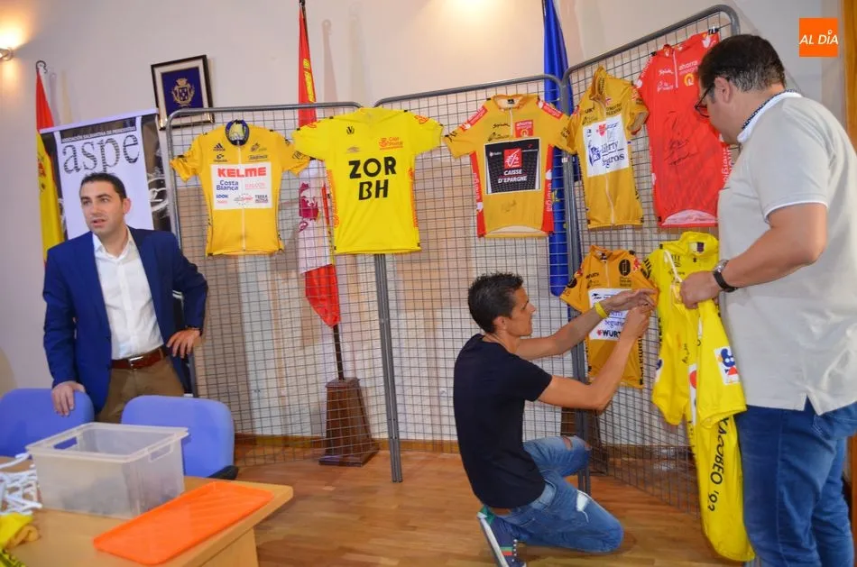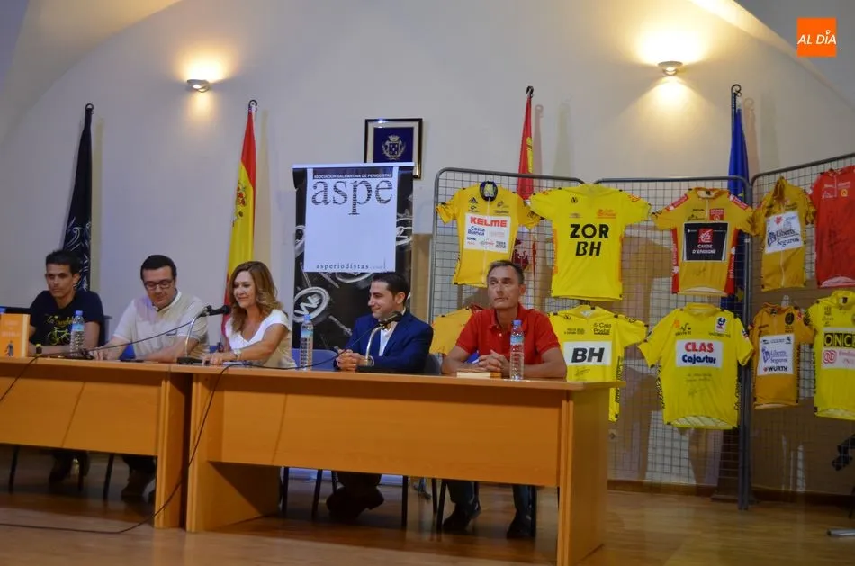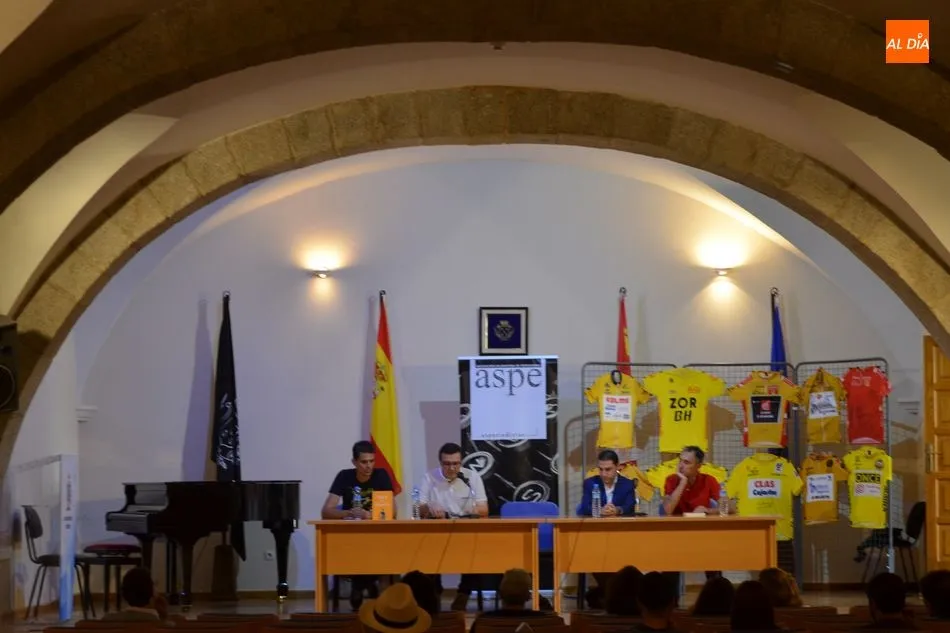 La colección de David Martín de maillots amarillos de grandes líderes del ciclismo ha servido como telón de fondo para la presentación del libro de Roberto Domingo, que ha estado acompañado de Laudelino Cubino y del periodista Ignacio Coll. A iniciativa de este último se ha presentado el libro en Béjar, una propuesta que surgió por ser ambos miembros de la Asociación Salmantina de Periodistas.