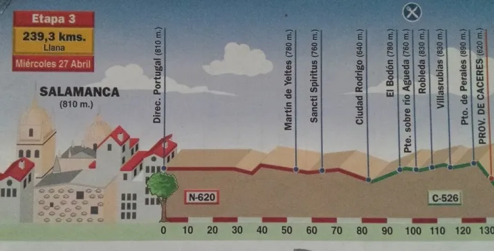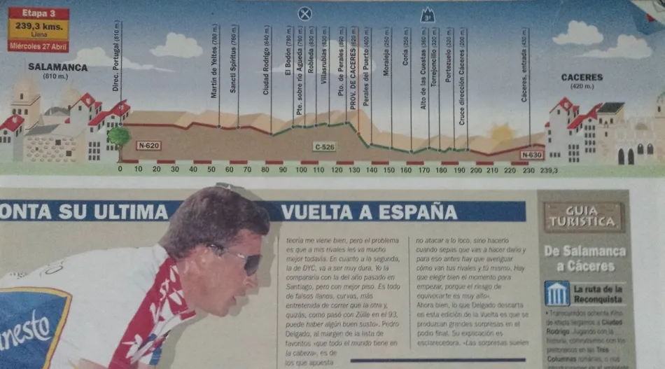 Volviendo a la etapa de referencia, el pelotón llegó desde Salamanca ?donde Mario Cipollini había sufrido en el sprint del día anterior una espeluznante caída- por la Nacional 620 a Ciudad Rodrigo, en una época en la que no había ni rastro de autovía, y ni siquiera estaba lo que se conoció como ?el desvío? en Miróbriga.