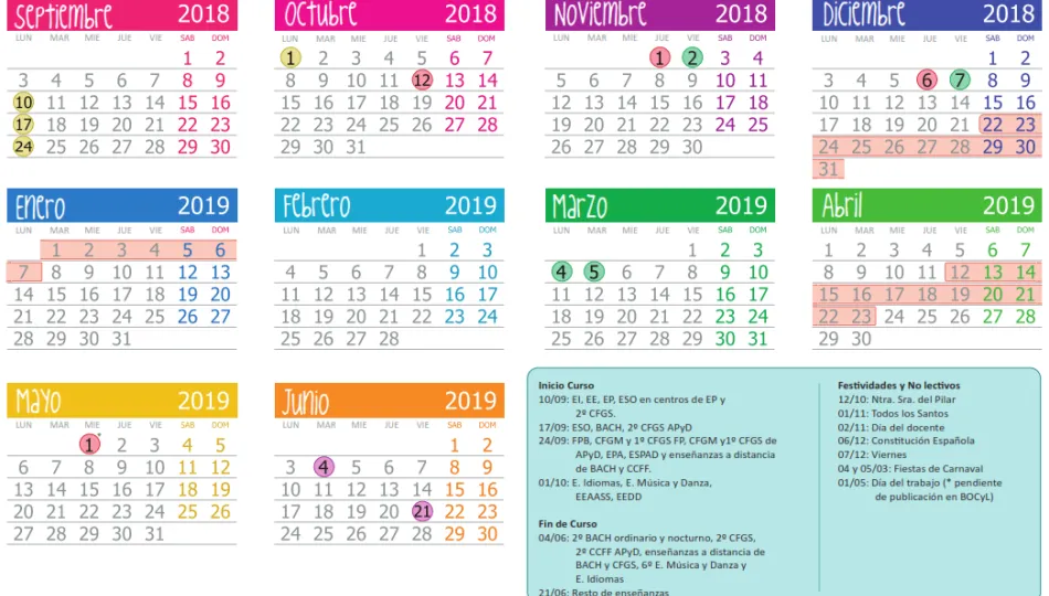 El calendario del curso 2018-2019 también establece los periodos vacacionales, festividades laborales y días no lectivos. Así, las vacaciones de Navidad comprenderán del 22 de diciembre al 7 de enero y las de Semana Santa, del 12 al 23 de abril.