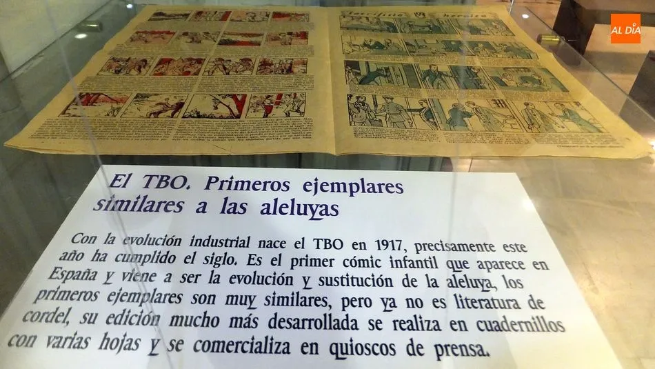 En una vitrina de la sala se recogen los primeros ejemplares del TBO, que se considera heredero de las aleluyas. En 1917 surge el TBO el primer comic infantil en España, los primeros son similares, pero ya no es literatura de cordel, sino que se edita como un cuadernillo con varias hojas y que se vende en los quioscos de prensa.