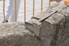 Concretamente, esos fragmentos se han desprendido de la parte central superior del pretil, donde varias grapas metálicas están ejerciendo como sujeción, evitando por el momento que la estructura caiga al foso pese a que tiene una notabilísima inclinación (que parece que ha ido ligerísimamente a más en las últimas horas).