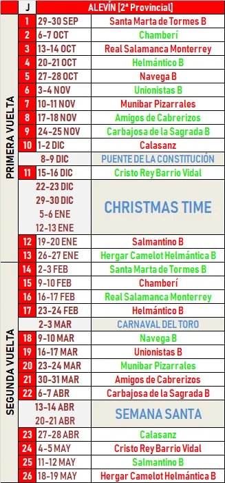 En torno al Alevín A, jugará siempre a la inversa que los otros tres equipos mencionados: es decir, cuando el Juvenil, el Cadete y el Infantil jueguen en casa, el Alevín A lo hará fuera, y viceversa. Sus rivales serán: Santa Marta de Tormes B, Chamberí, Real Salamanca Monterrey, Helmántico B, Navega B, Unionistas B, Munibar Pizarrales, Amigos de Cabrerizos, Carbajosa de la Sagrada B, Calasanz, Cristo Rey Barrio Vidal, Salmantino B y Hergar Camelot Helmántica B.