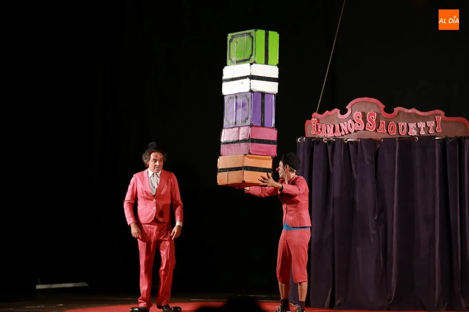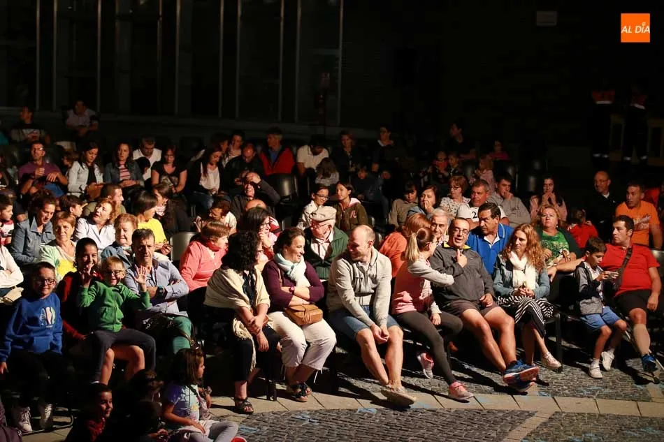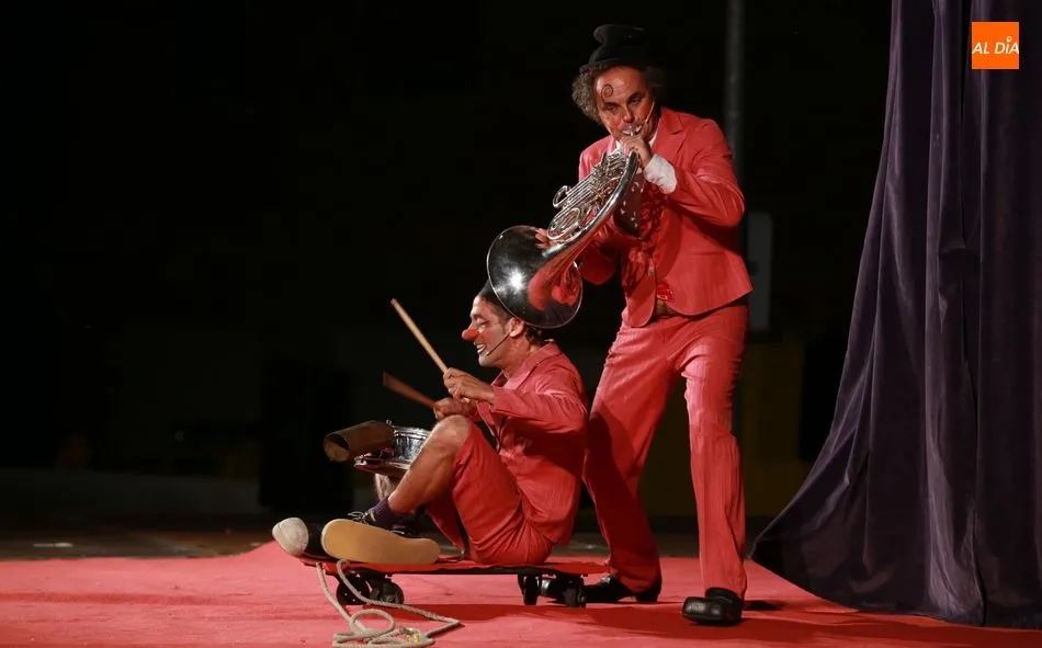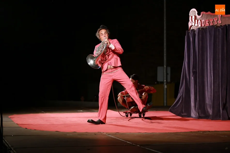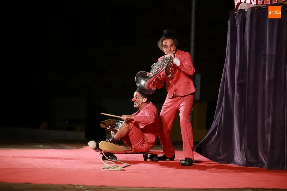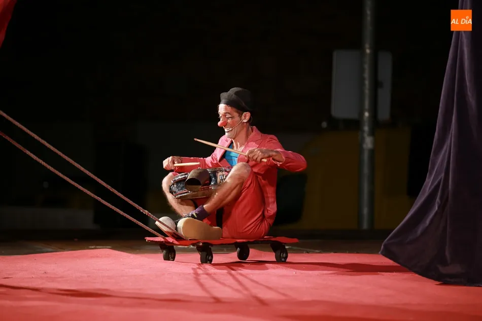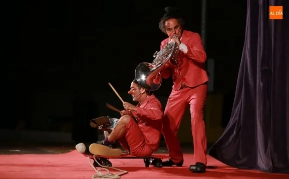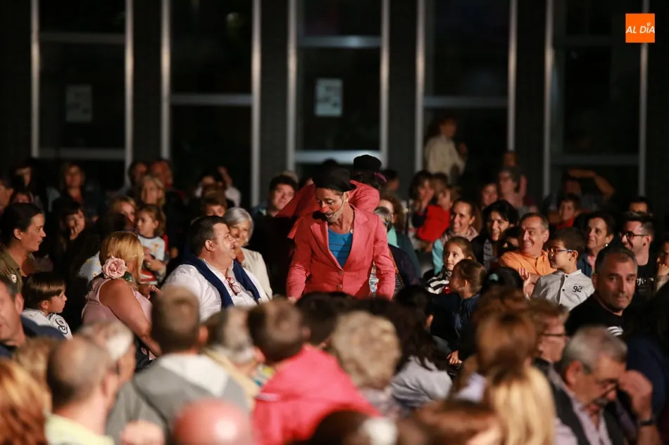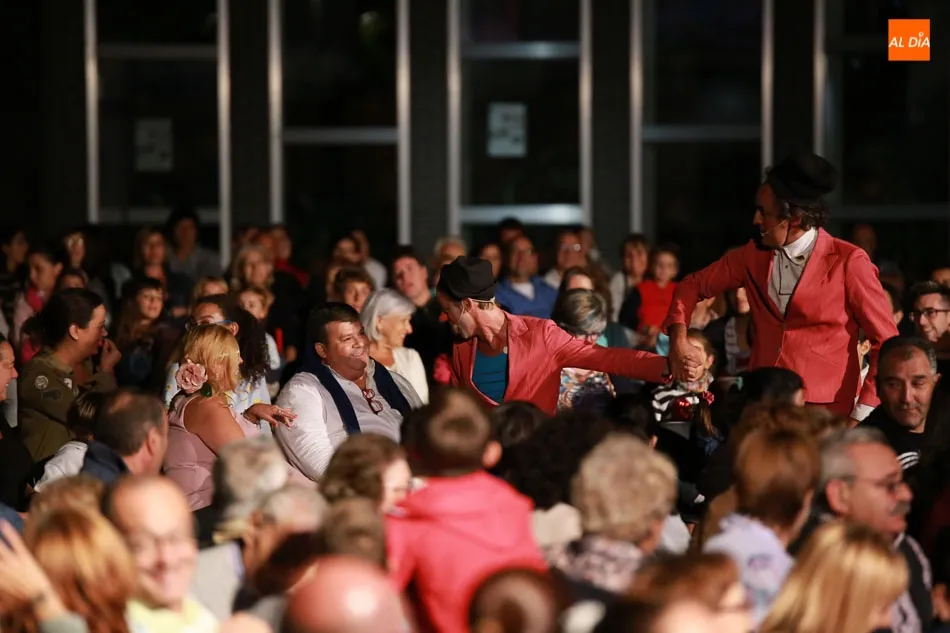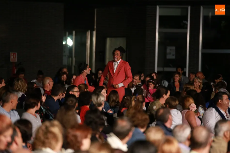 La compañía Cie I.Si representaba esta noche su espectáculo ?Si et Là? con una importante asistencia de público y con lluvia en algunos momentos. Se trata de un espectáculo familiar, poético, musical, sin palabras que habla de consumo excesivo, poder, crueldad, ternura, a través de dos personajes nómadas, que viven escasamente sin perder.