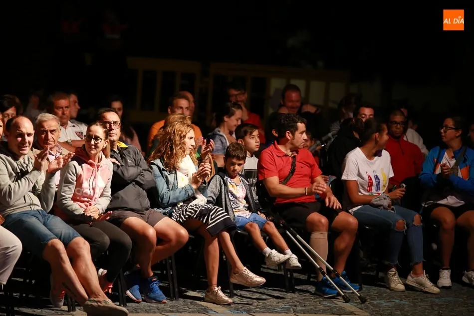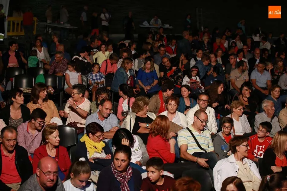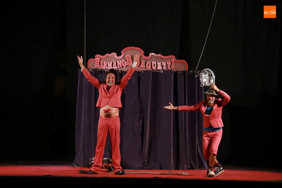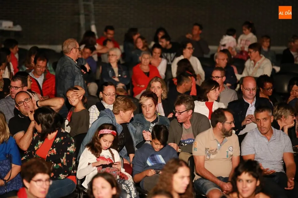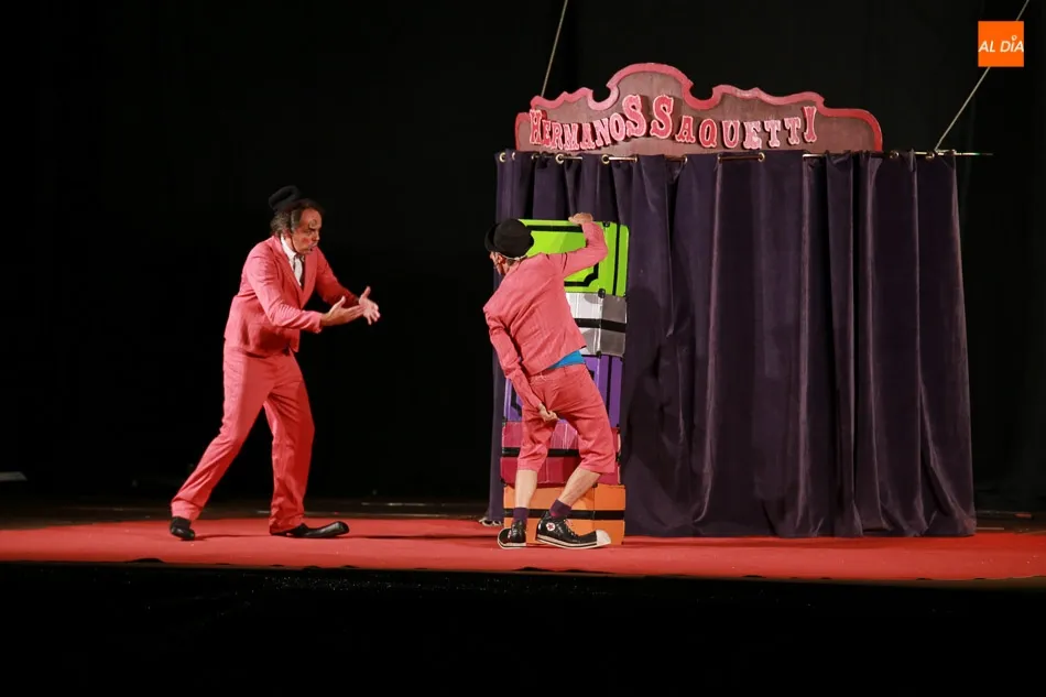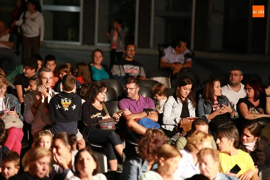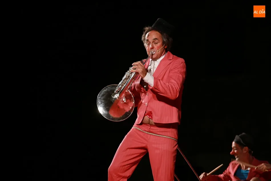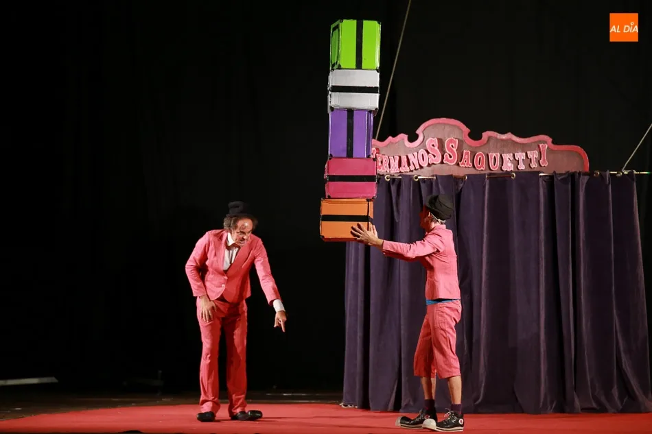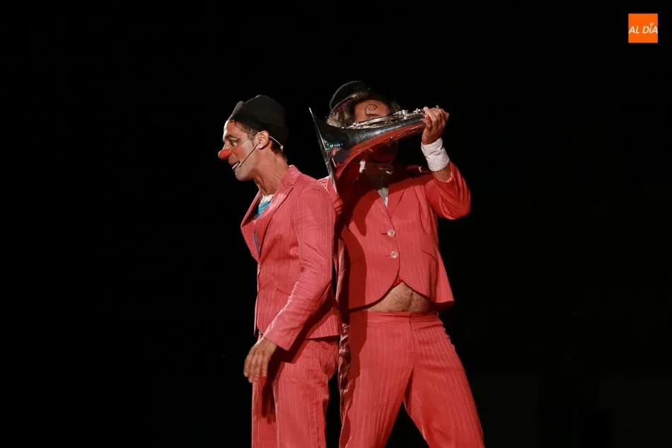 La compañía Cie I.Si representaba esta noche su espectáculo ?Si et Là? con una importante asistencia de público y con lluvia en algunos momentos. Se trata de un espectáculo familiar, poético, musical, sin palabras que habla de consumo excesivo, poder, crueldad, ternura, a través de dos personajes nómadas, que viven escasamente sin perder.
