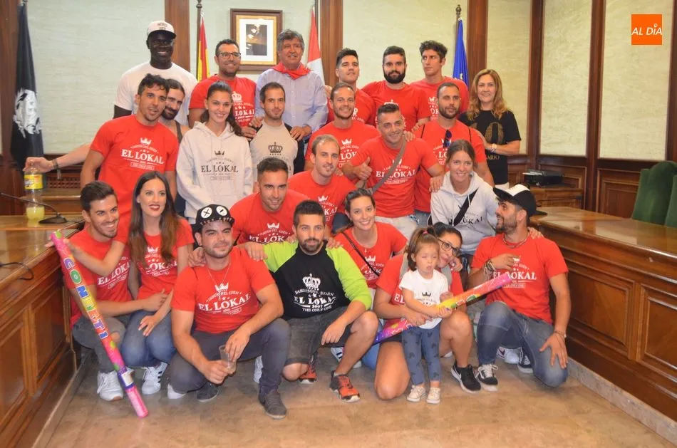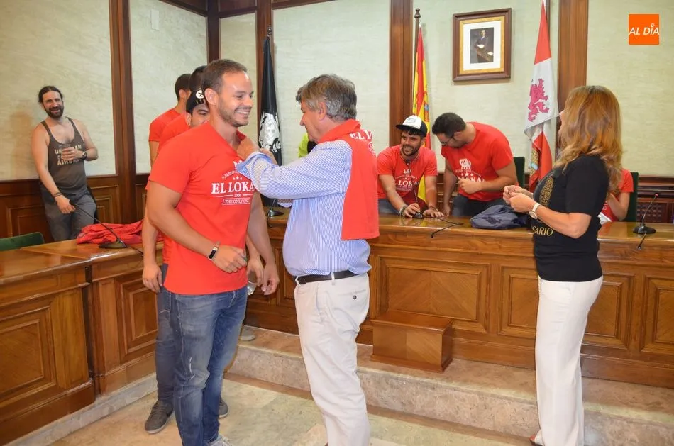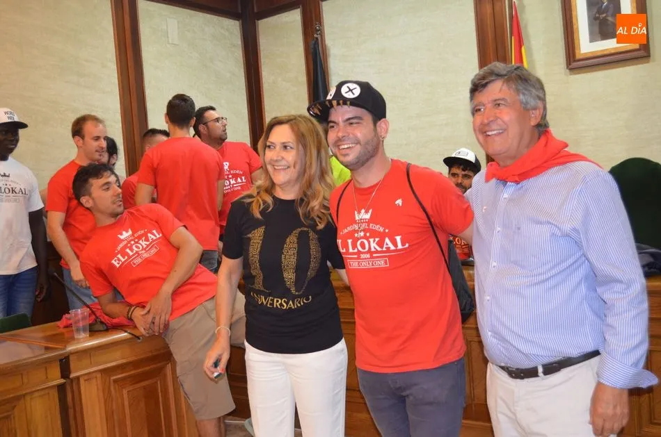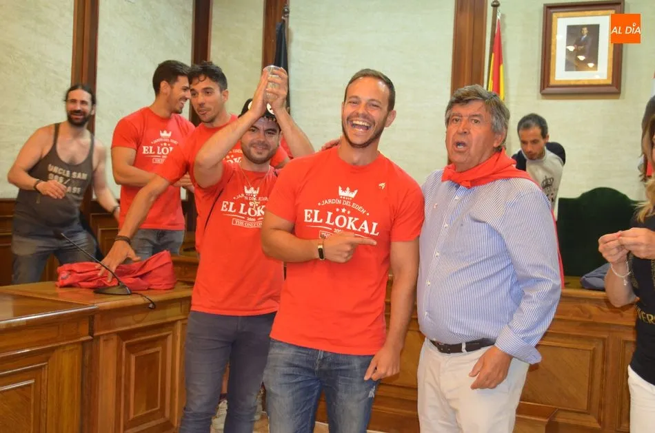 Al finalizar el pregón y el lanzamiento del chupinazo, Alejo Riñones ha impuesto a los componentes del peña El Lokal, la insignia de la abeja que representa a la ciudad.