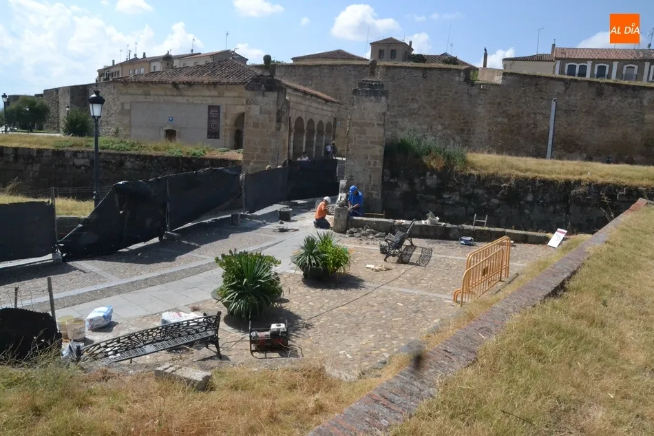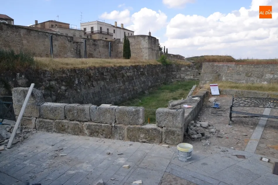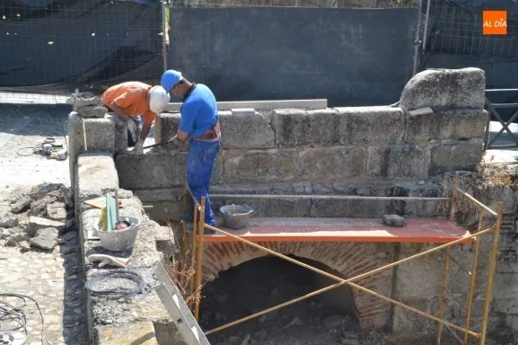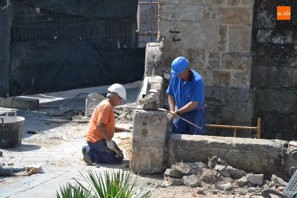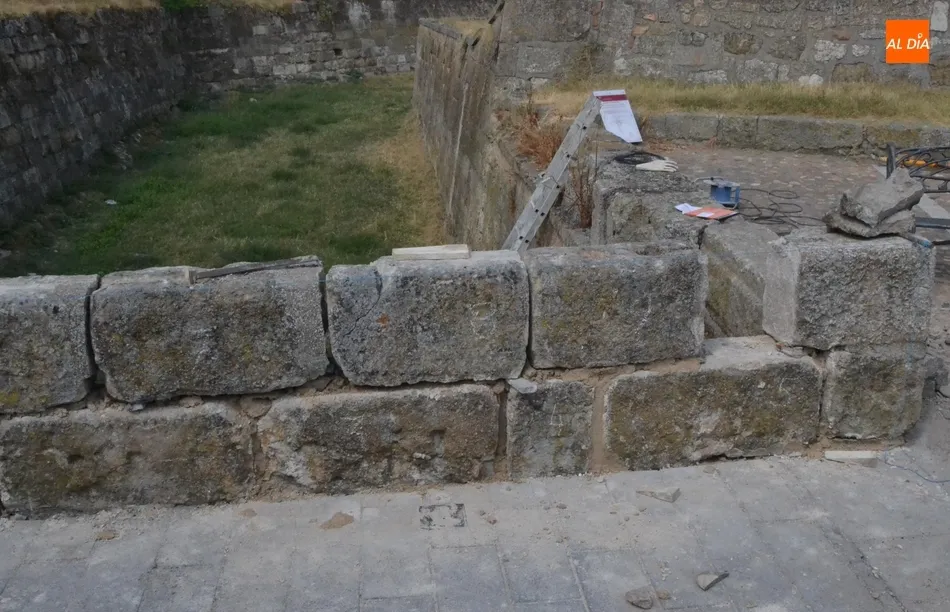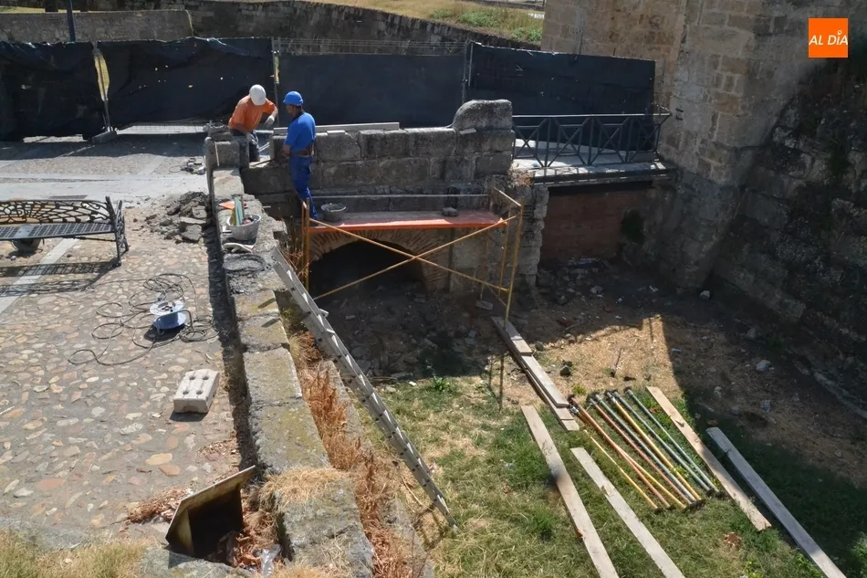 Tras adjudicar de forma directa el Ayuntamiento la intervención a una empresa, en la mañana del jueves se pusieron manos a la obra, con un importante despliegue de medios, que implicó por ejemplo el empleo de maquinaria pesada para la recolocación de los sillares y el montaje de andamios en el foso. Durante la misma mañana del jueves, los sillares ya recuperaron la plena verticalidad, trabajándose posteriormente en su sujeción.