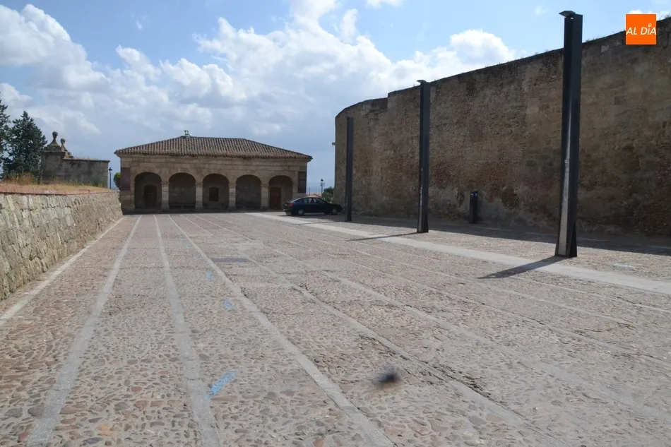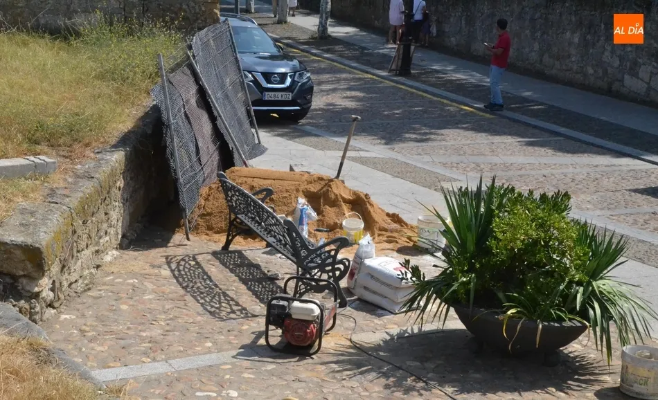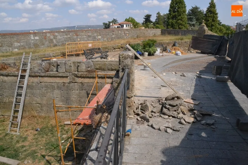 En la mañana del jueves dio arranque la operación de arreglo del pretil situado en la entrada al Registro que fue golpeado el lunes de la semana pasada por un vehículo mientras subía a esa zona. Como hemos publicado a lo largo de estos días, el golpe en el pretil provocó una notable inclinación hacia el foso de varios de los sillares de los que se compone, desprendiéndose incluso varios fragmentos de uno de los sillares de la parte superior.
