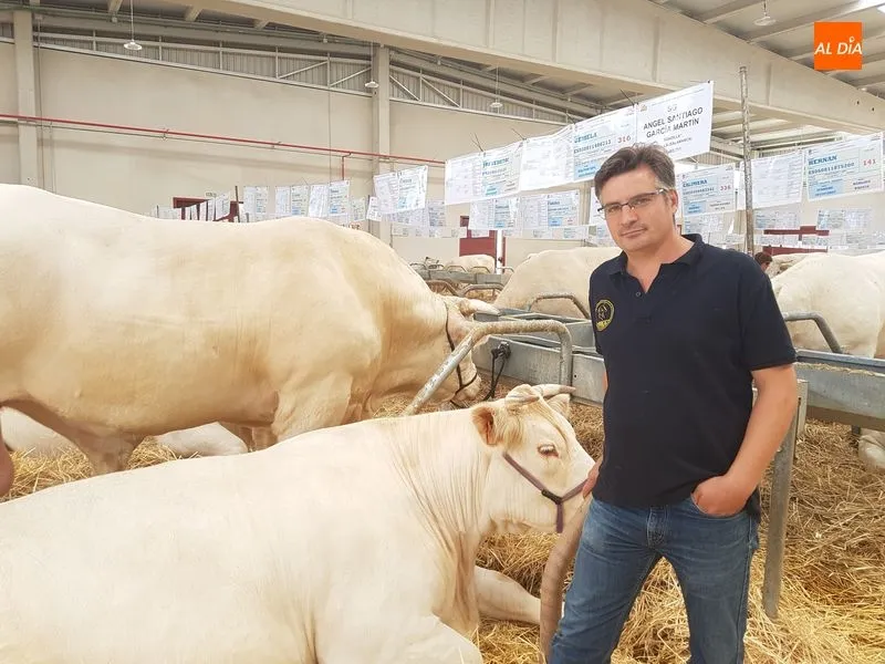 Ángel Santiago García, de Boadilla, es uno de los ganaderos fijos en la XXX Exposición Internacional de Ganado Puro que cada edición se marcha a casa con importantes premios del concurso nacional. Este año acude al certamen con 13 animales, de los que tres salen a subasta, entre ellos un toro adulto, el que más ha pesado, 1.450 kilos.