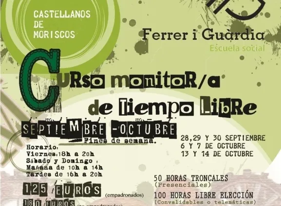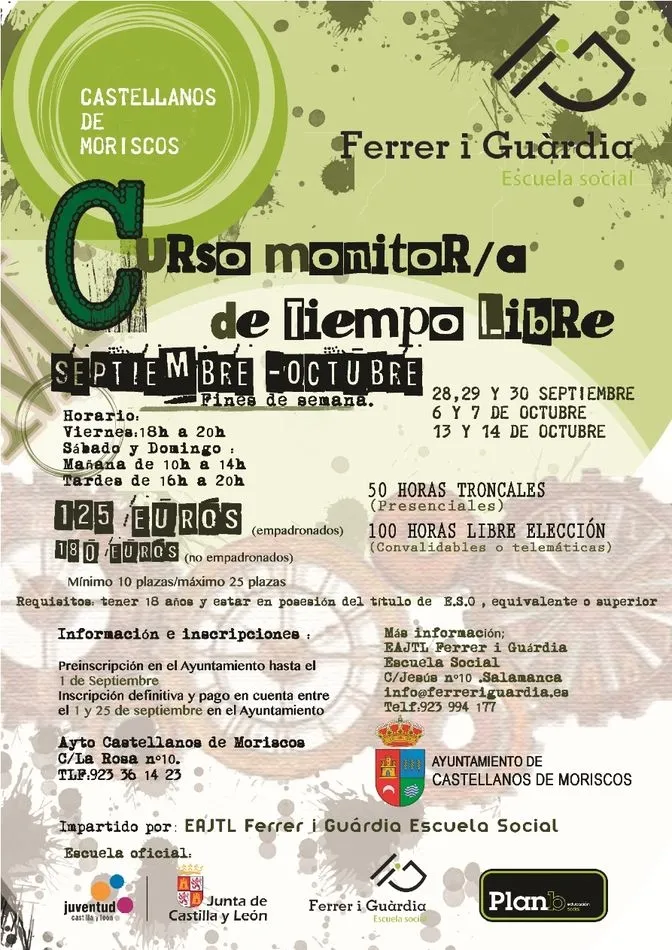 El Ayuntamiento de Castellanos de Moriscos, junto a la Escuela Social Ferrer i Guardia, organizan un Curso de Monitor de Tiempo Libre los fines de semana del 28,29 y 30 de septiembre; 6 y 7 y 13 y 14 de octubre.