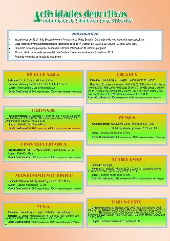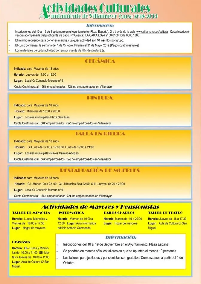 El Ayuntamiento de Villamayor abre el próximo lunes, 10 de septiembre, el plazo para la inscripción en las actividades culturales y deportivas para el curso 2018-2019. Las inscripciones se podrán realizar desde la plataforma del Ayuntamiento o entrando en www.villamayor.es/cultura.
