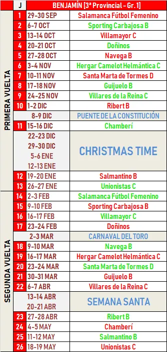 Por último, el Prebenjamín sí tendrá este año una temporada ?normal?, con dos vueltas, en el Grupo 1 de la 3ª División Provincial, donde se mezclan las dos situaciones que vivirán el Alevín B y el Benjamín, es decir, la categoría está repleta de filiales y hay 2 clubes que aportan 2 equipos: Hergar Camelot Helmántica y Santa Marta de Tormes, que cuentan con sus equipos C y D.