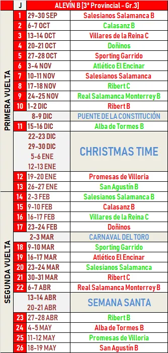 En lo que se refiere al Alevín B del Club mirobrigense, está encuadrado en el Grupo 3 de la 3ª División Provincial, donde como hecho más novedoso hay dos clubes que tienen 2 equipos cada uno: el Salesianos Salamanca, que cuenta en este grupo con sus equipos A y B, y el Ribert, que pone en liza a sus formaciones B y C.