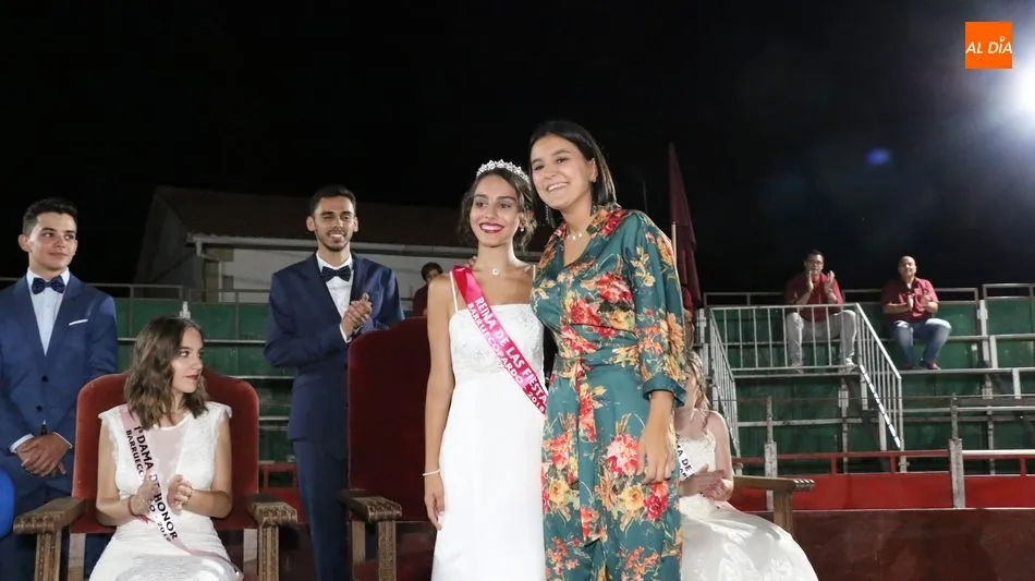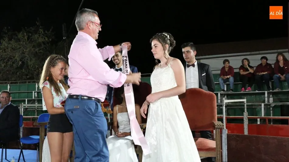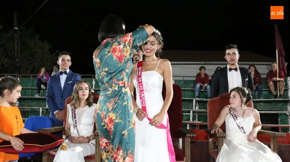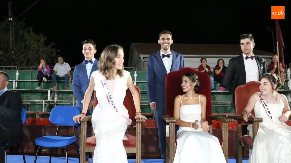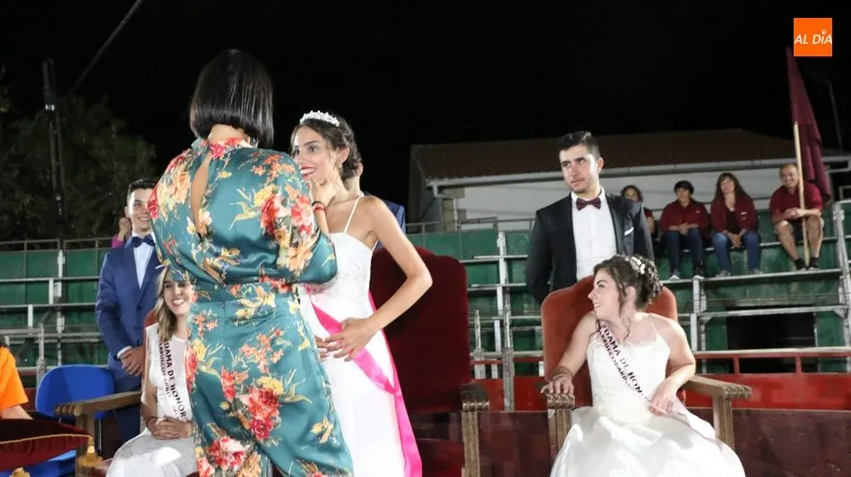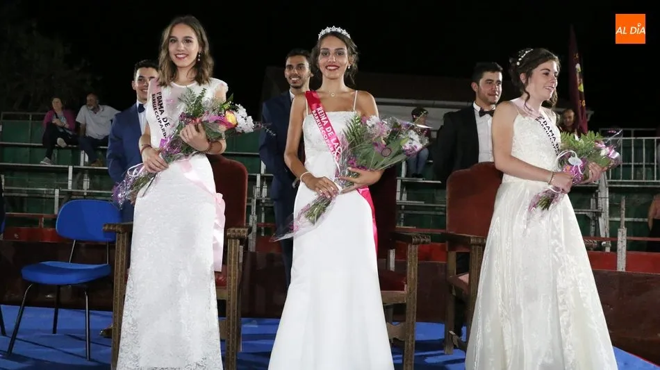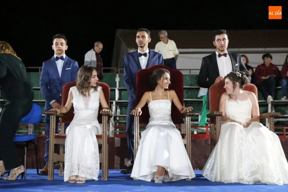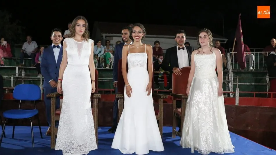 A continuación, la corte de honor de las fiestas recibía sus bandas y ramos de flores, además de ser coronada su reina, papel que ha recaído este año en Marina Romo Santamaría, que está acompañada por Belén Pereira Martín y María Patino Corredera en el papel de damas.