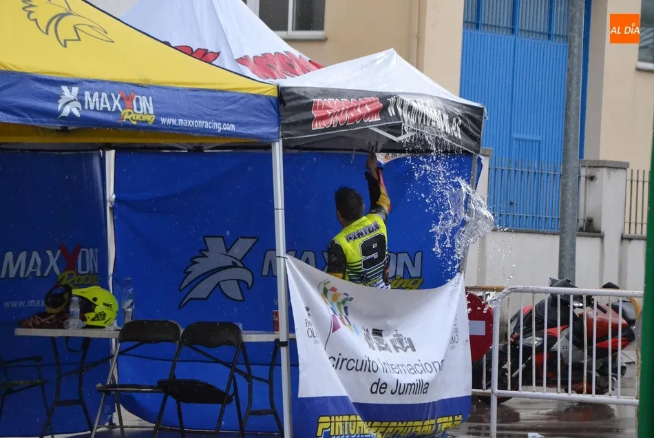 Por motivos de seguridad, la carrera se canceló inmediatamente, momento en que todas esas personas que estaban refugiadas de cualquier manera corrieron a la carpa, a donde llegaron completamente calados. El aguacero duró alrededor de 15 minutos, y aunque todo el mundo estaba a cubierto, en mitad del mismo uno de los pilotos de supermotard se puso a rodar, uniéndosele poco después uno de pit bike (sus monturas eran más problemáticas sobre mojado).