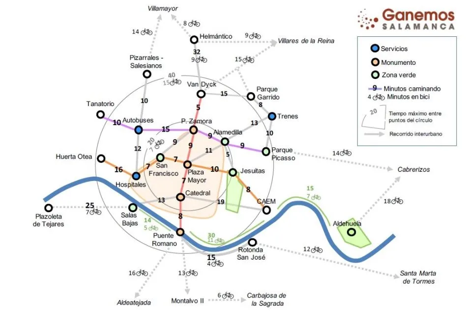 Salamanca es una ciudad para caminarla o para recorrerla en bici y, por eso, Ganemos defiende la creación de rutas de movilidad que potencien estos hábitos. Es el caso de las rutas escolares seguras, un asunto por el momento ?olvidado en el cajón del alcalde?, o la creación del llamado ?metro-minuto?,un plano elaborado por el equipo técnico de Ganemos que recoge los tiempos de los trayectos entre los principales puntos de la ciudad, tanto si son realizados a pie como en bicicleta.
