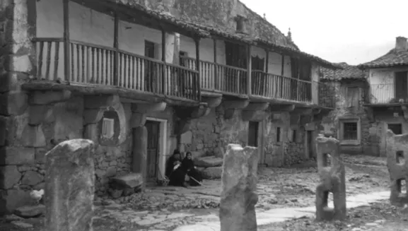 En las fotografías adjuntas vemos su antigua plaza mayor con sus balconadas de madera a lo largo de todo el frente, sostenidas por sólidos cachorros, tejadillos a dos aguas y tejas sobre listones de madera, muy similares a los pueblos serranos.