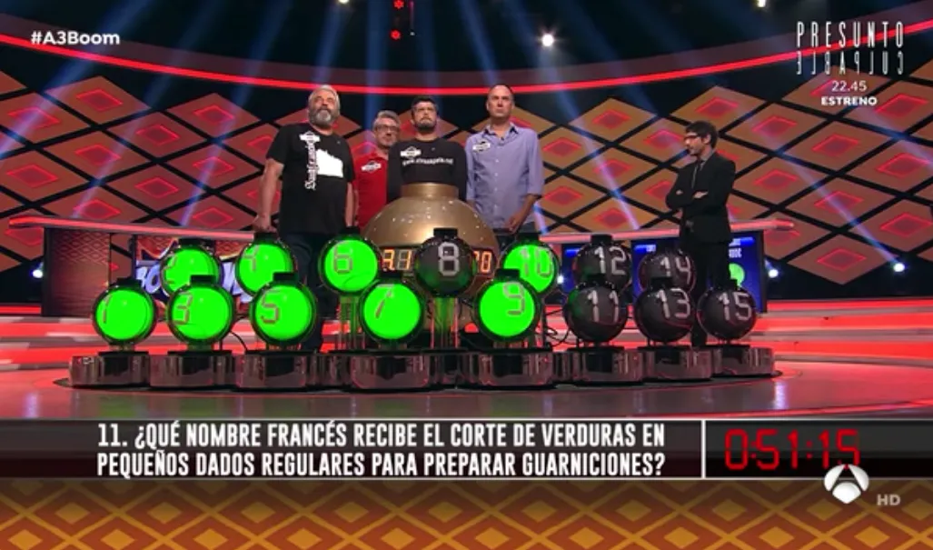 Un corte de cocina que sí sabían en el público deja a Los Lobos a 1 pregunta de llevarse el bote ... | Imagen 1A esta bomba final habían llegado los 4 integrantes de Los Lobos, tras superar sin holguras, pero sin apuros, a sus rivales, un buen equipo llamado Los Noveleros. En esta bomba final, Los Lobos hicieron una muy buena primera pasada, dejando solo 2 preguntas sin contestar.