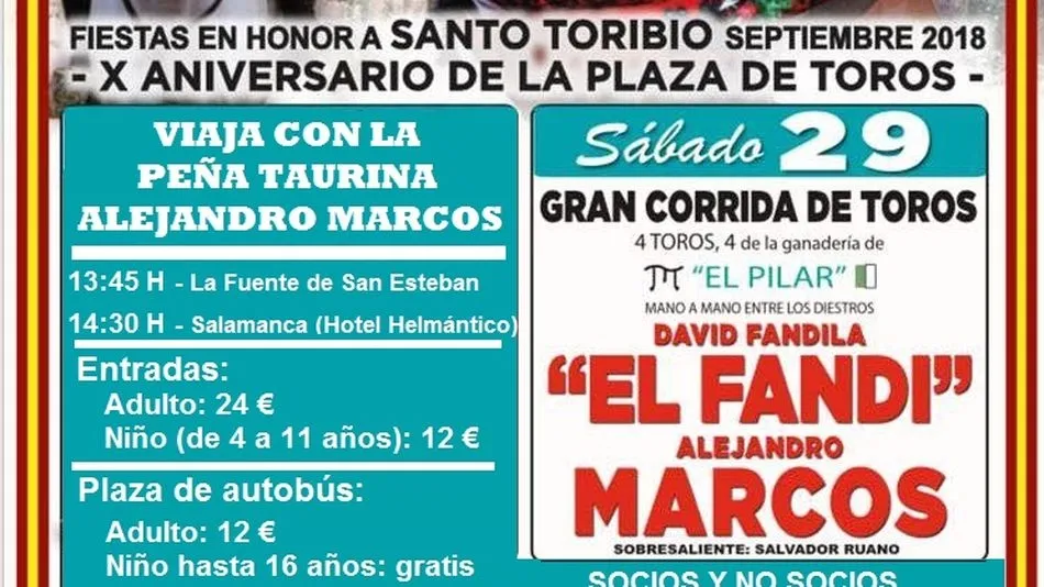 La Peña Taurina Alejandro Marcos ha preparado un viaje en autobús a Mayorga, Valladolid, para ver la corrida de toros en la que Alejandro Marcos compartirá cartel mano a mano con El Fandi, con astados de la ganadería ?El Pilar? y que dará comienzo a las 17 horas.