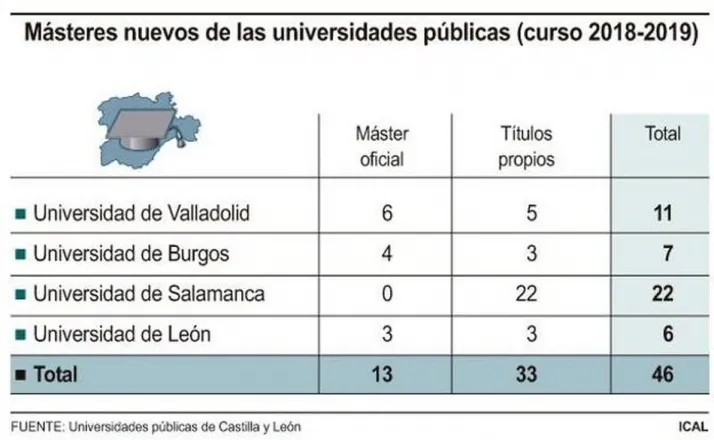 Las cuatro universidades públicas de la comunidad con sede en Valladolid, Burgos, León y Salamanca incorporarán este curso 2018-2019 un total de 46 másteres de nueva implantación, de los cuales 13 son oficiales y necesitan un año para impartirse previa evaluación, correcciones y cambios sugeridos sobre el plan de estudio y registro en el Ministerio de Educación. Además, figuran otros 33 títulos propios de máster, cuyo diseño y supervisión para su puesta en marcha corresponde a cada universidad de forma interna y el proceso es mucho más ágil.