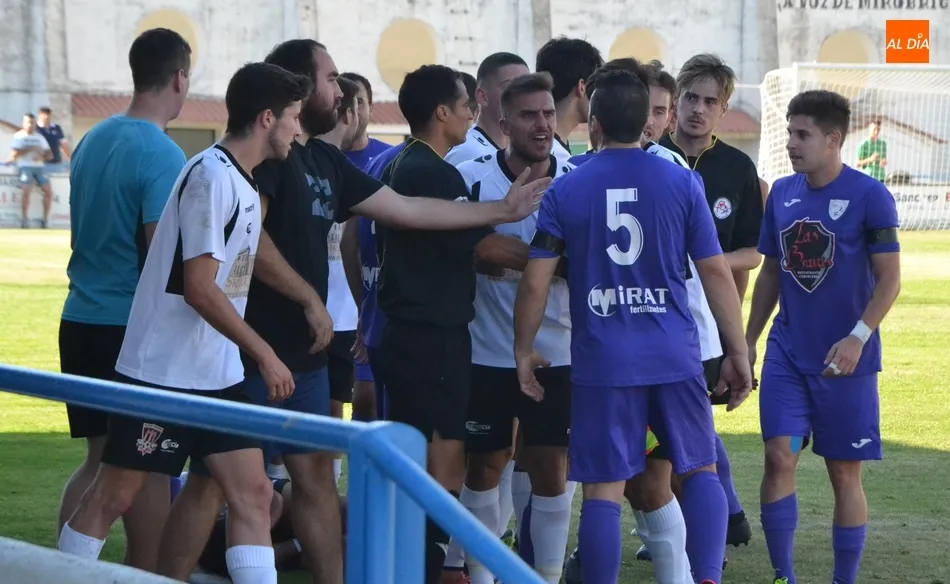 Gracias a esa bronca en la grada, el público estuvo entretenido en los primeros minutos, que ni mucho menos pasarán a la historia. La primera acción de relevancia que ocurrió en el césped tuvo lugar en el 7?: un disparo visitante desde la derecha del área, que solventó Manu. Para la siguiente acción destacada, hubo que esperar hasta el 21?, cuando el portero mirobrigense atrapó un disparo por alto. Unos minutos después, Manu cogió directamente uno de los varios balones a balón parado ?en este caso en un córner- que puso en juego en la primera parte el Ribert, que estuvo muy cómodo en el tramo central de este período.