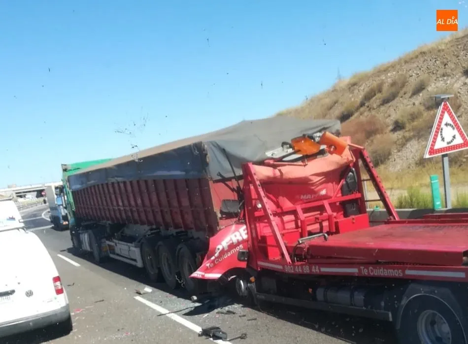 Un camión grúa de Mapfre ha chocado, por alcance, con un tráiler, cuando circulaban por el kilómetro 340 de la A-66, próximo a la rotonda de Buenos Aires. Hasta el lugar se desplazaron efectivos de la Guardia Civil y del Sacyl, además de los bomberos, que habían recibido aviso de que una persona permanecía atrapada en en el camión grúa, de marca MAN.