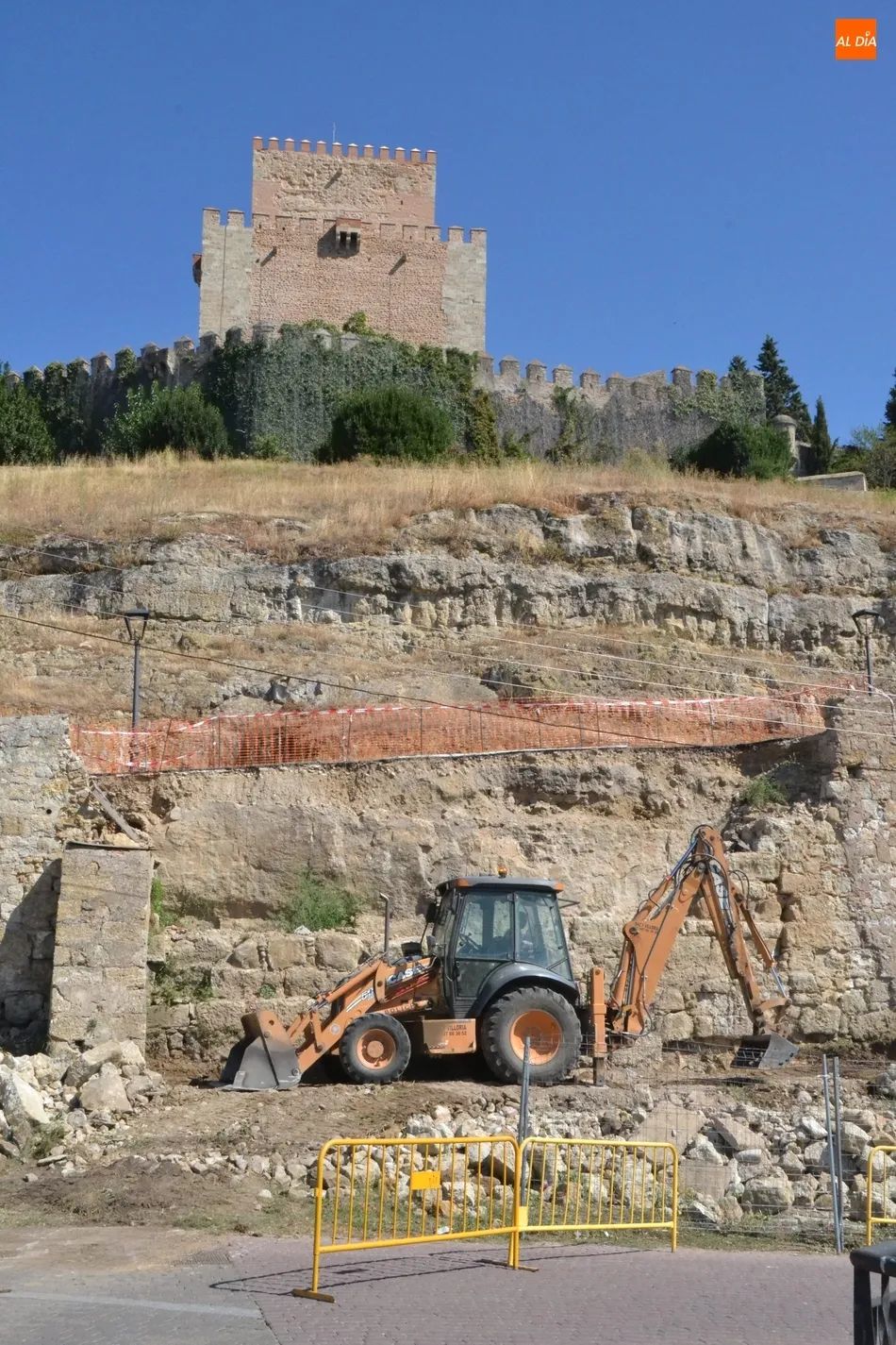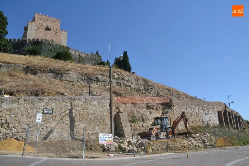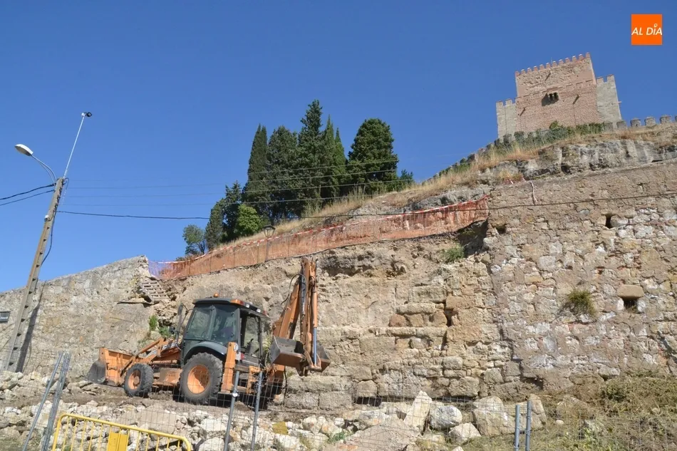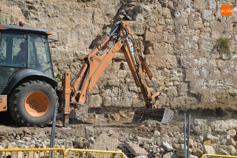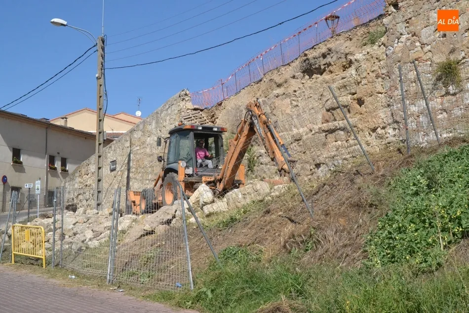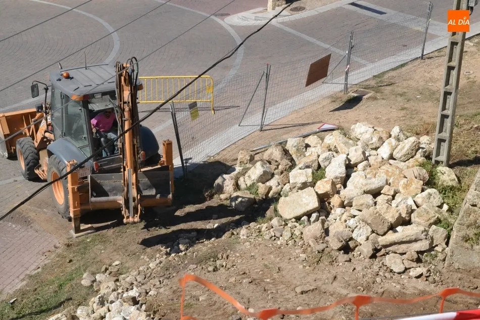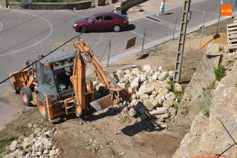 Como ?segundo? paso, en la mañana del martes se estuvo trabajando en el lugar con la idea de crear una base sobre la que asentar la plataforma elevadora a la cual se subirán los trabajadores para ir reconstruyendo el muro. Tal y como explicó a Ciudad Rodrigo Al Día Joaquín Pellicer, para llevar a cabo este arreglo se van a reutilizar las propias piedras que se desmoronaron hace medio año, que se van a unir con mortero bastardo.