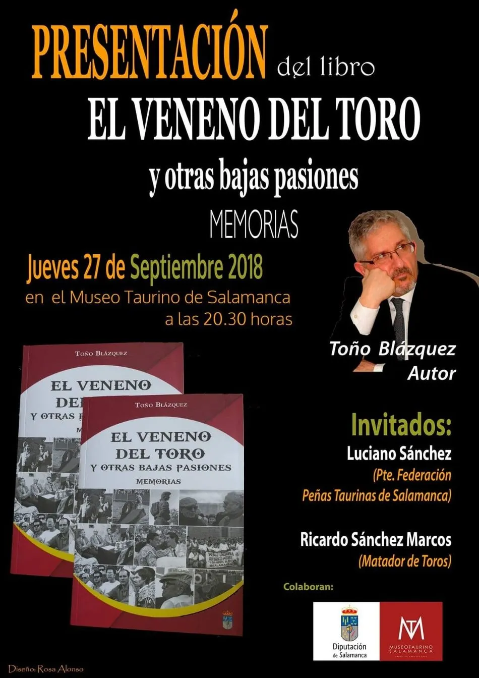 El Museo Taurino Primitivo Sánchez Laso acogerá el próximo jueves 27 de septiembre la presentación del nuevo libro de Toño Blázquez ?El Veneno del Toro, y otras bajas pasiones?. La jornada tendrá lugar a las 20.30 horas y contará con la presencia de Luciano Sánchez, presidente de la Federación de Peñas Helmántica, Ricardo Sánchez Marcos, matador de toros, y el autor, Toño Blázquez.