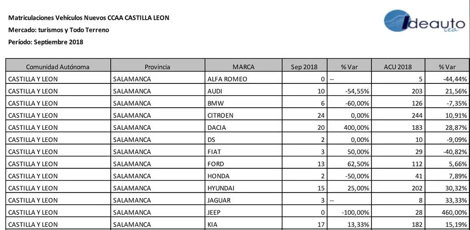 Durante el mes de septiembre han descendido las matriculaciones en Salamanca un 14,54%. En total se matricularon durante este periodo 288 vehículos entre. Como resultado, en 2018, durante este mes, se ha registrado la matriculación de 288 vehículos frente a las 337 unidades matriculadas en 2017. En total durante todo este año se acumulan 3556 matriculaciones en toda Salamanca, una cantidad 10,57% superior a la del año pasado.