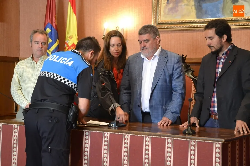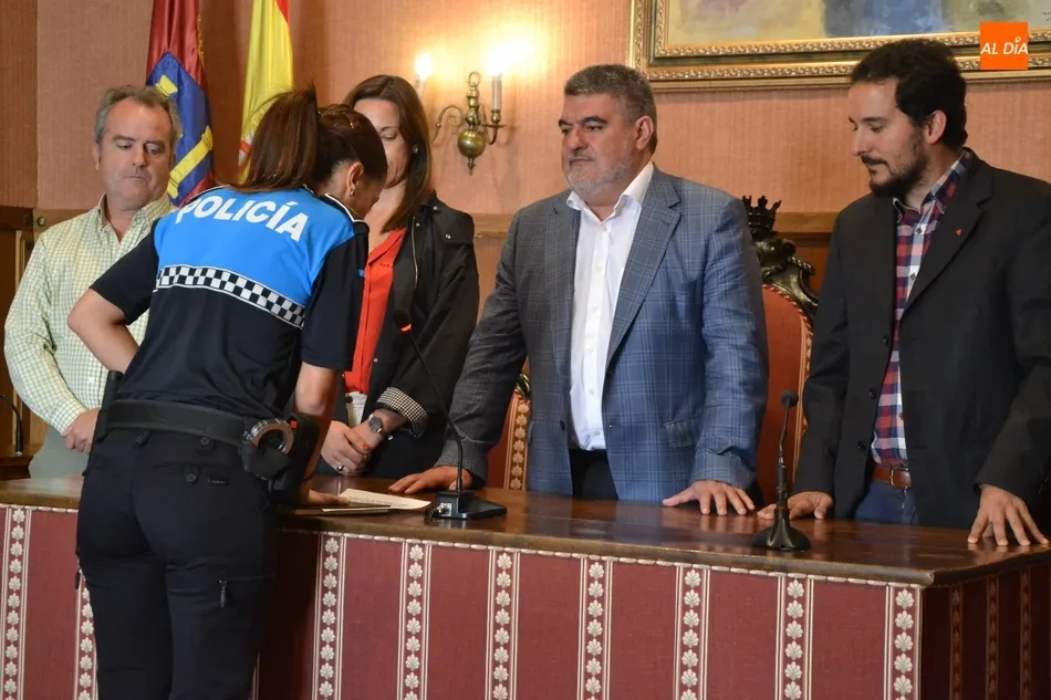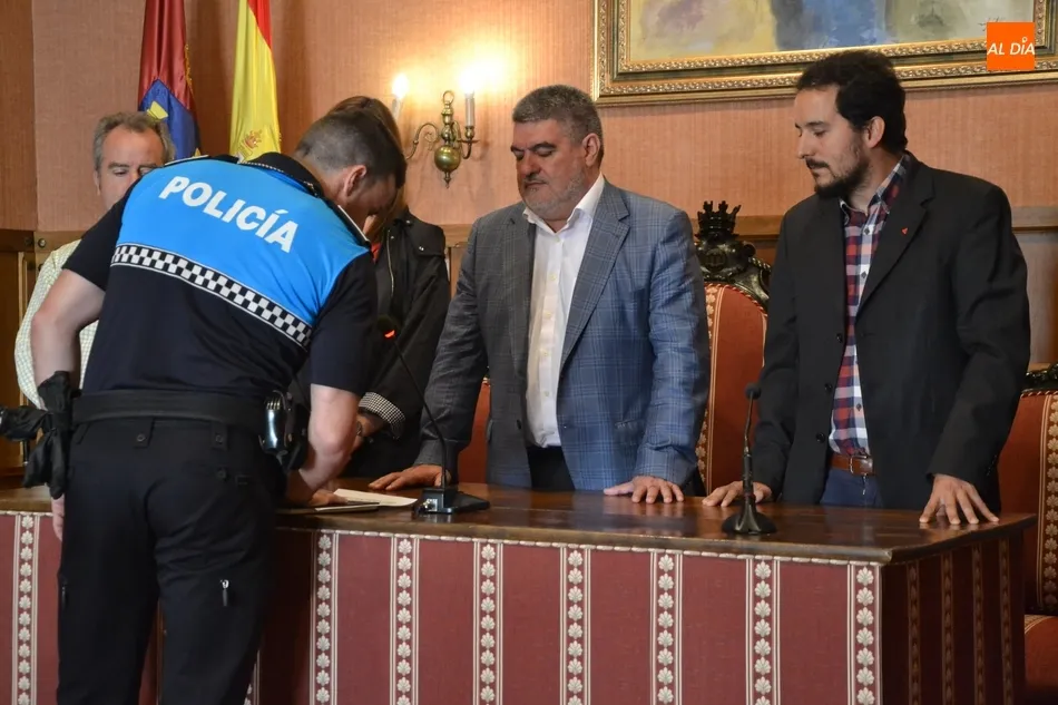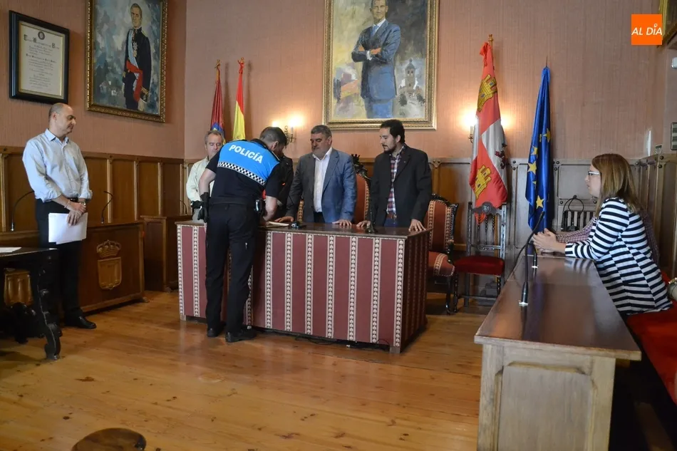 El solemne acto de toma de posesión de las plazas tuvo lugar en el salón de plenos del Ayuntamiento, donde se dieron cita, además de los nuevos agentes, el alcalde Juan Tomás Muñoz, los concejales Begoña Moro, Domingo Benito, Joaquín Pellicer, Carlos Fernández Chanca y Alejandra Méndez, así como varios agentes más de la Policía mirobrigense, y el secretario Carlos Hernández, que fue el encargado de dar lectura a la resolución en la cual se oficializa que han superado el XXXVIII Curso Básico de Formación para policías locales.