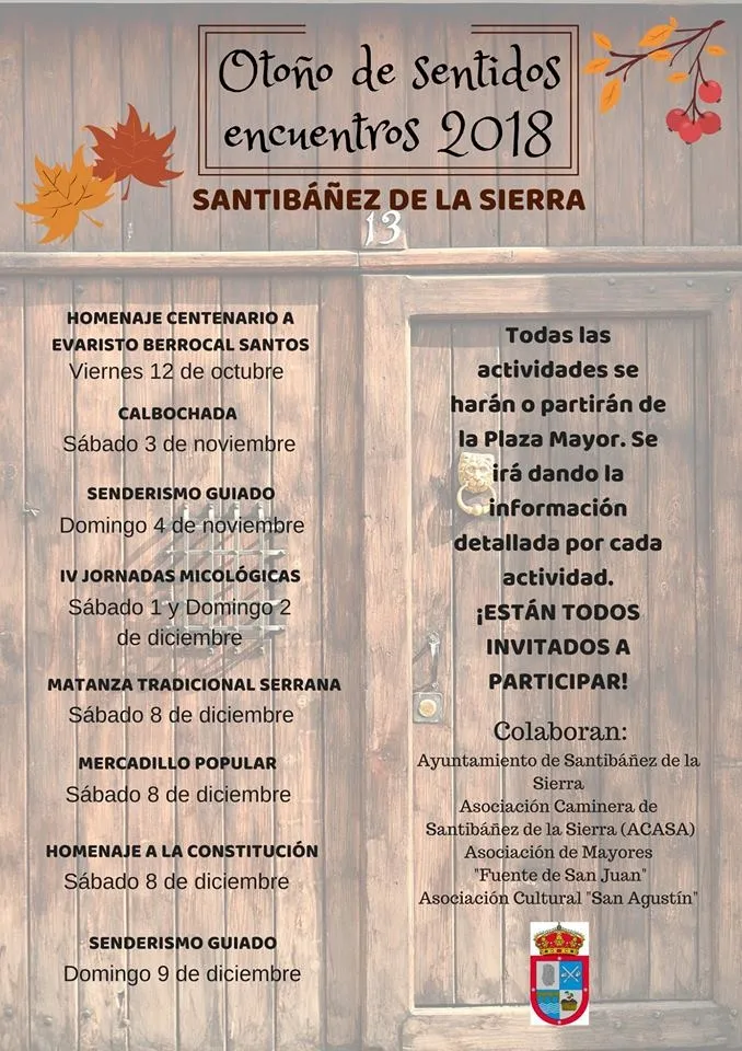 El 'Otoño de Sentidos' vuelve a Santibañez de la Sierra la próxima semana, con un programa de actividades que se extenderá hasta el inicio del mes de diciembre. Entre las propuestas se vivirá una calbochada para dar la bienvenida al otoño, la cuarta edición de las jornadas micológicas, la matanza tradicional serrana y el homenaje a la Constitución.
