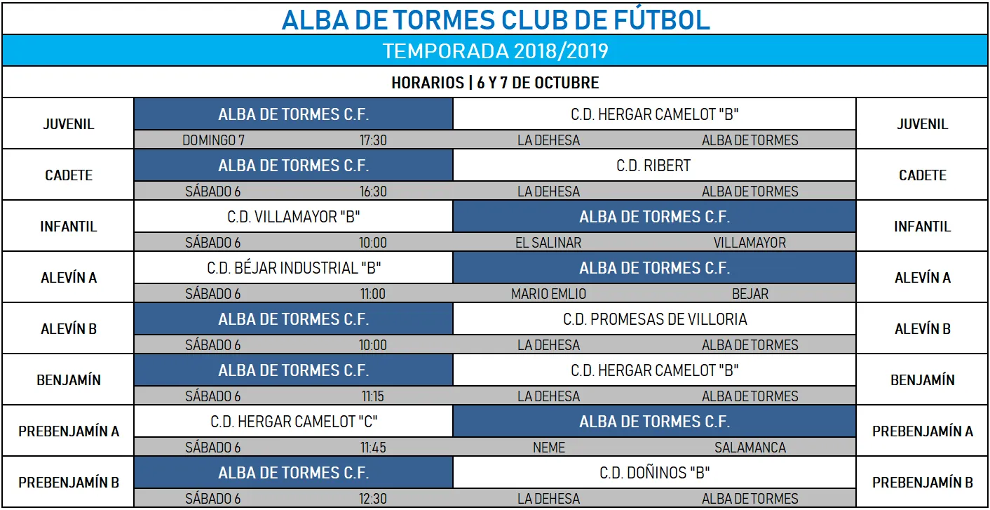 Los ochos equipos del Alba de Tormes Club de Fútbol regresan este fin de semana a la competición tras iniciar sus respectivas ligas la pasada semana. Cinco de los conjuntos del club buscarán la victoria en Alba de Tormes, mientras que tres de ellos tendrán que desplazarse fuera de la villa ducal para disputar sus encuentros.