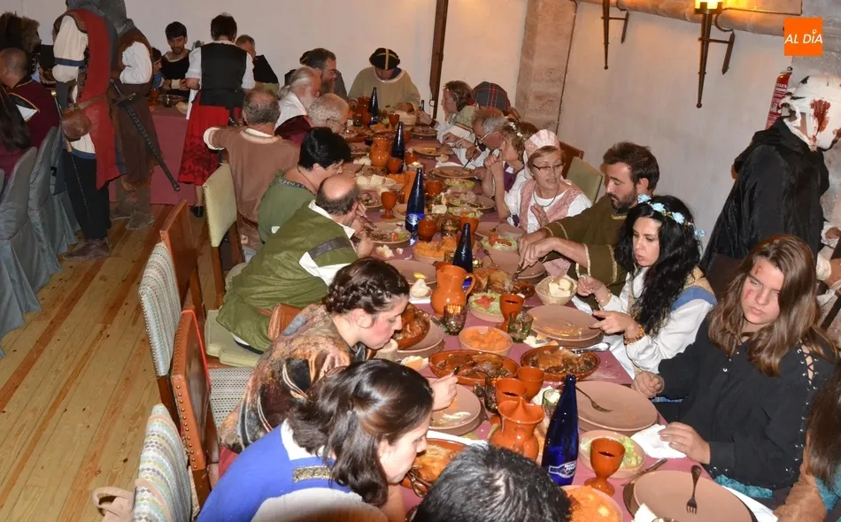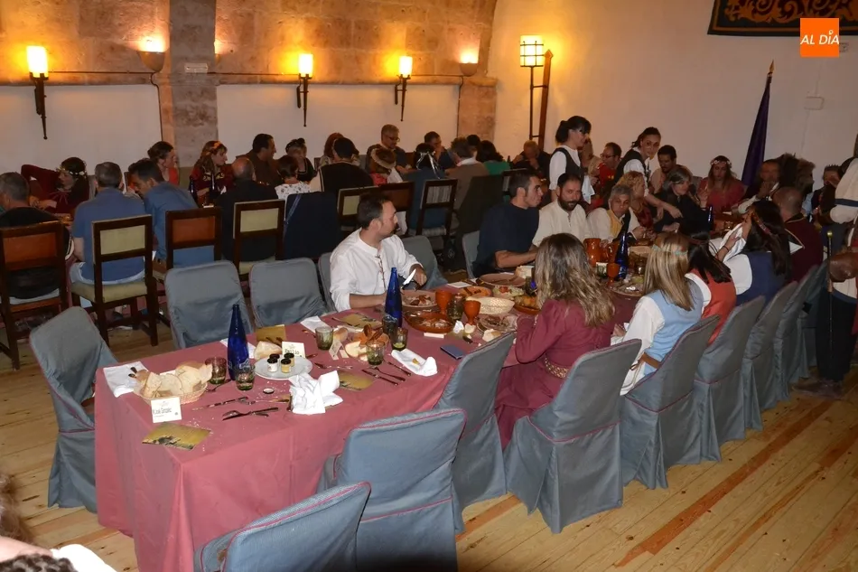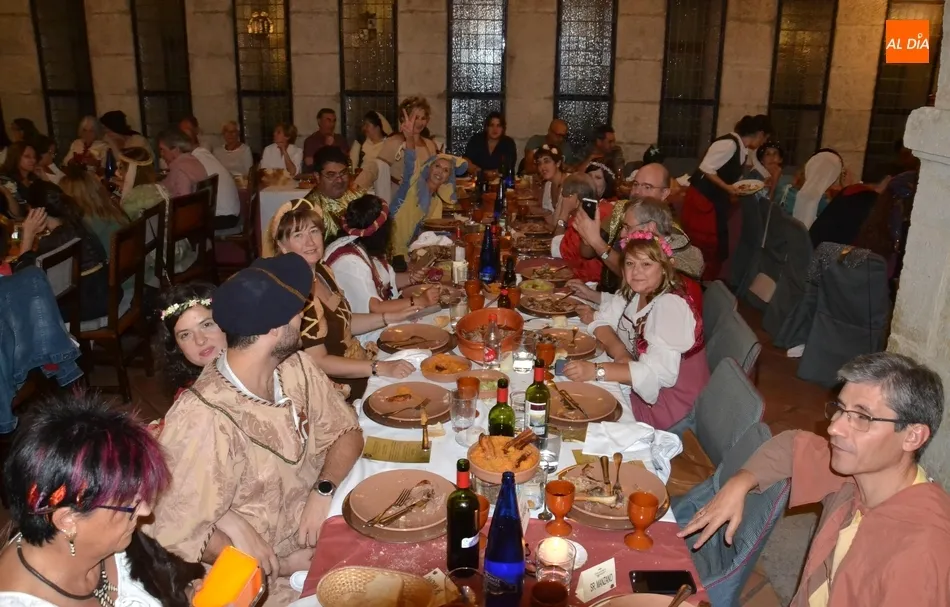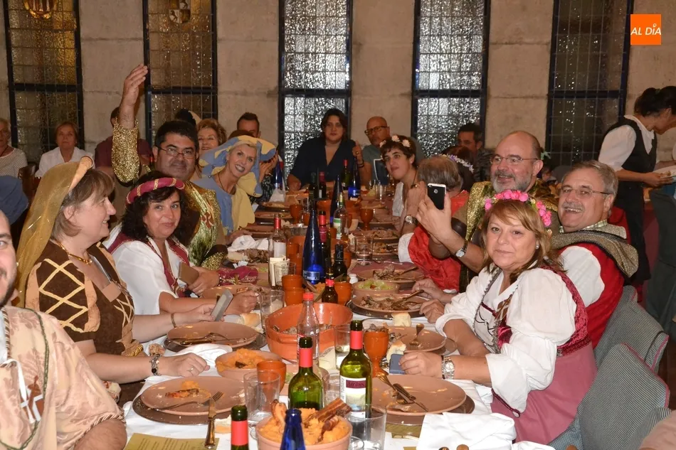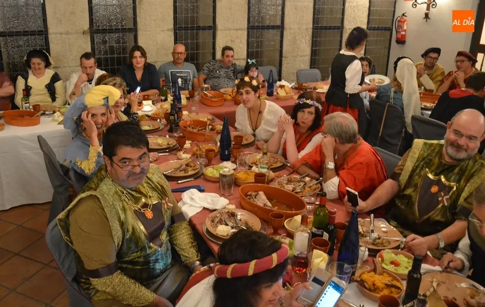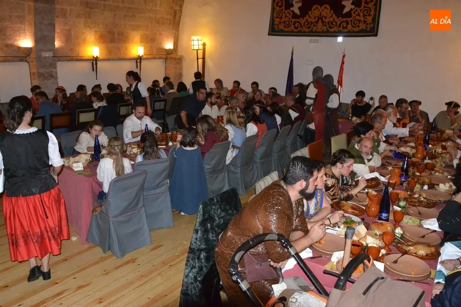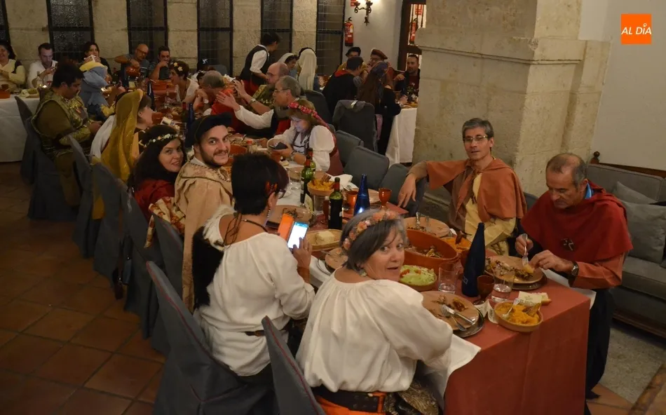 Una vez concluido el pregón de Soraya Mangas y la exhibición de danza oriental a cargo del Centro de Pilates y Danzas Tere, la programación de la Feria Medieval continuó en el interior del Parador de Turismo, con la Gran Cena Medieval, en la que se sentaron a la mesa un amplio número de comensales (este año fue necesario ocupar dos salones del Parador), la mayoría de ellos ataviados al estilo de la Feria.