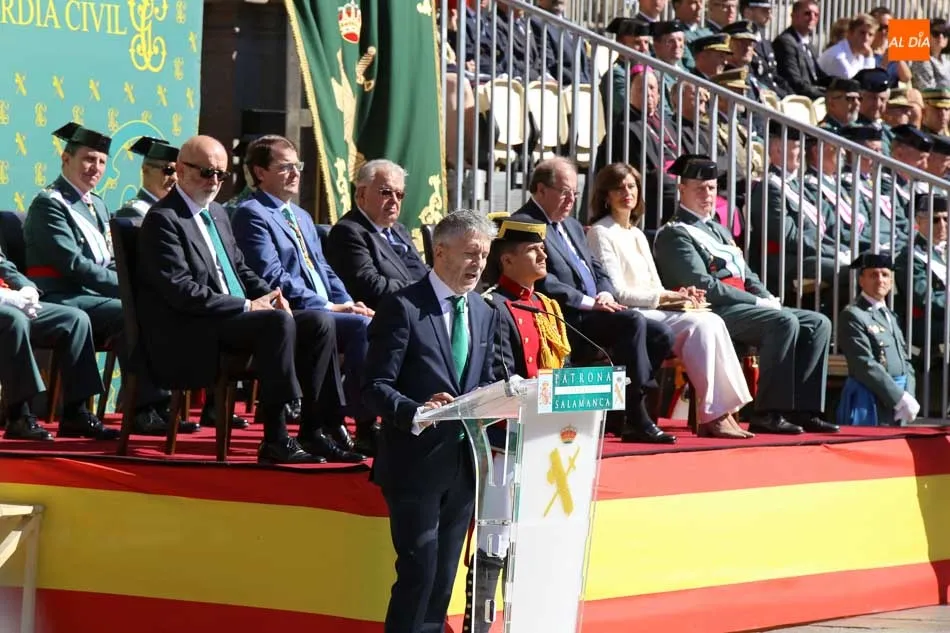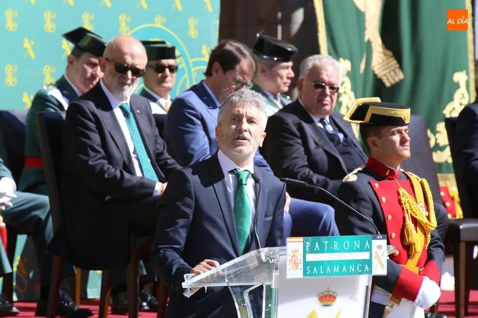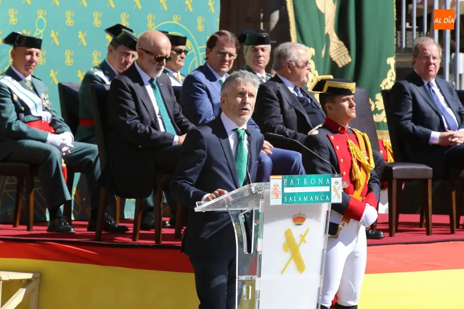 El turno del ministro del Interior llegó justo después. Marlaska comenzó su intervención ensalzando y reconociendo la labor que realizan los hombres y mujeres de la Guardia Civil, que según Marlaska, es necesaria para ?hacer frente a las amenazas de cada época? y, gracias a ella, ?la seguridad ciudadana ya no es una preocupación?. Además, el ministro quiso reiterar algunos datos del discurso de Azón recordando el 30 aniversario de la incorporación de las mujeres a la Guardia Civil, asegurando que ya son 5.530 las que forman parte del cuerpo en toda España.
