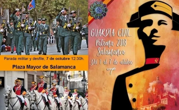 La Guardia Civil despide este domingo en Salamanca, con una parada militar y un desfile en la Plaza Mayor a las 12.30 horas, los actos conmemorativos por la festividad de su patrona, la Virgen del Pilar, que este año han tenido a la ciudad como sede de las actividades institucionales. El acto consistirá en una parada militar y desfile en el que participarán 650 efectivos y casi 50 vehículos pertenecientes a las diferentes unidades y especialidades de la Guardia Civil, a pie, a caballo y motorizadas.