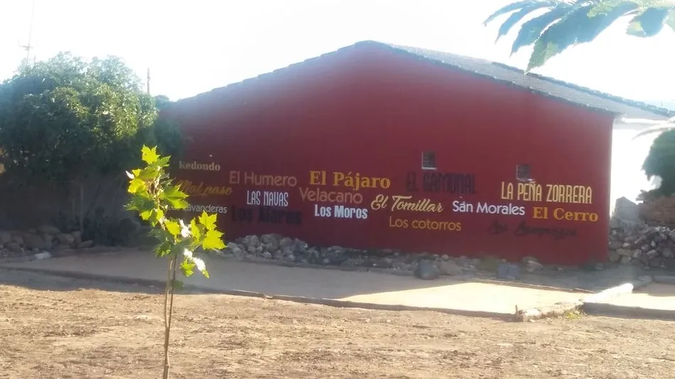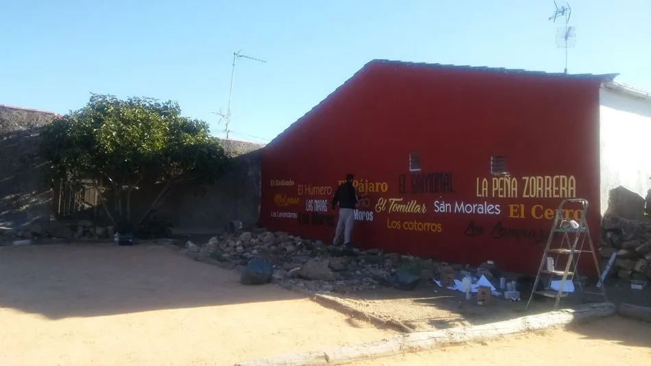 La pared de la casa cedida por un vecino ha servido para que el artista Decoma, ganador este año del certamen de pintura mural del municipio de Rágama, entre otros premios, haya dibujado palabras cuya temática representa los nombres de los parajes más conocidos del pueblo.