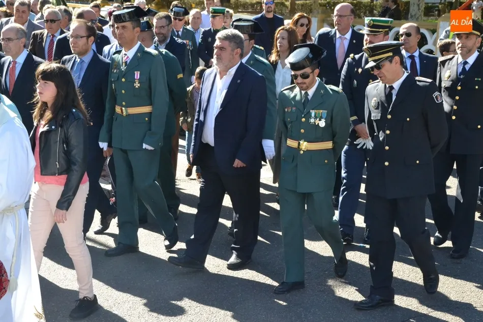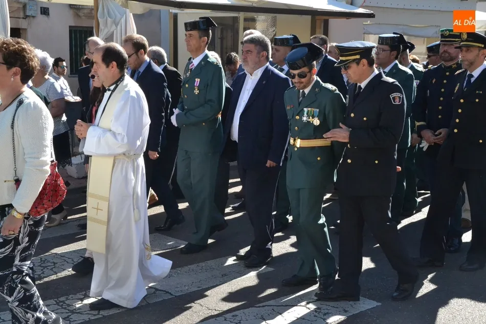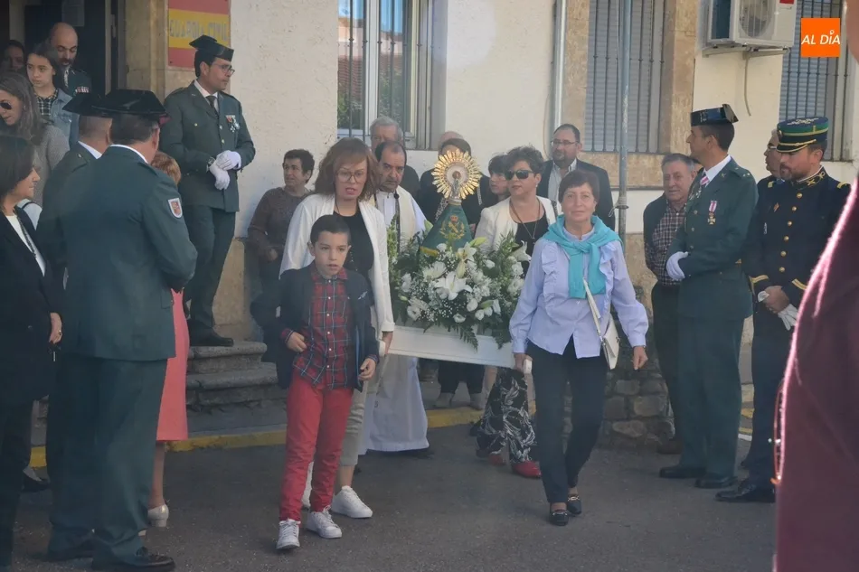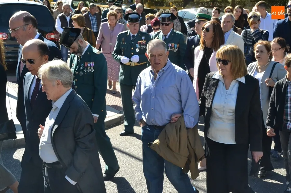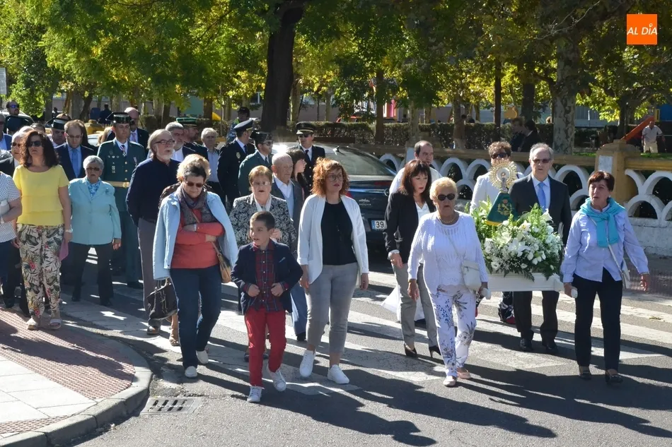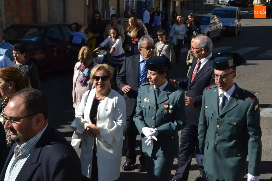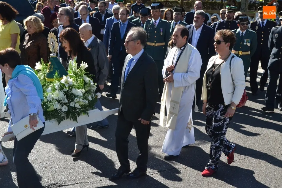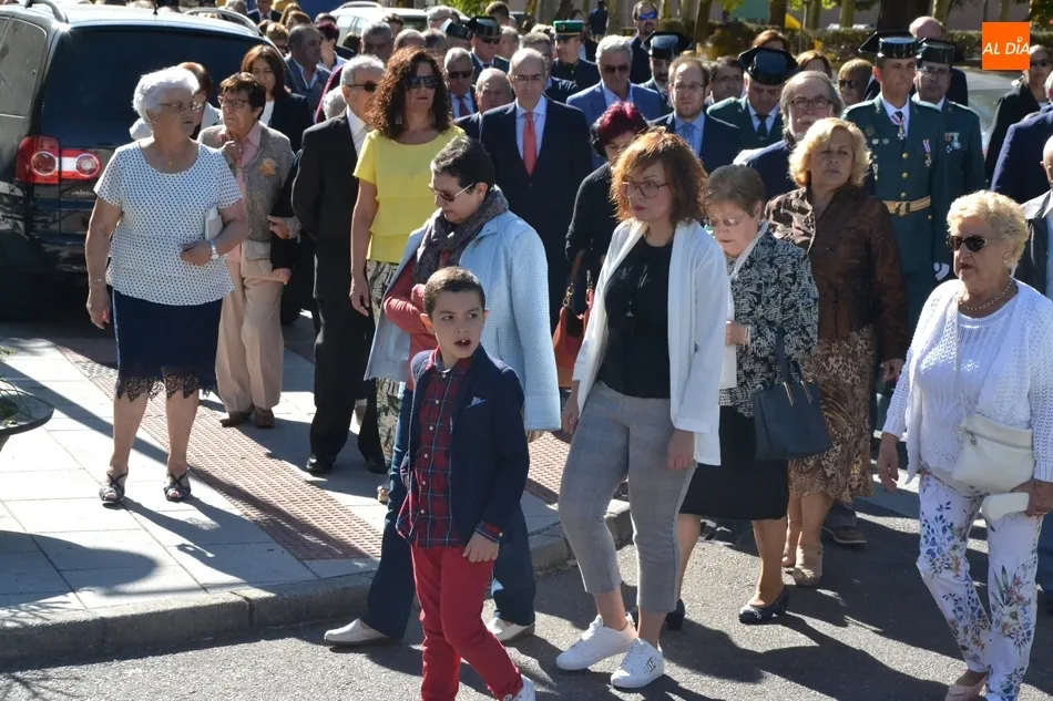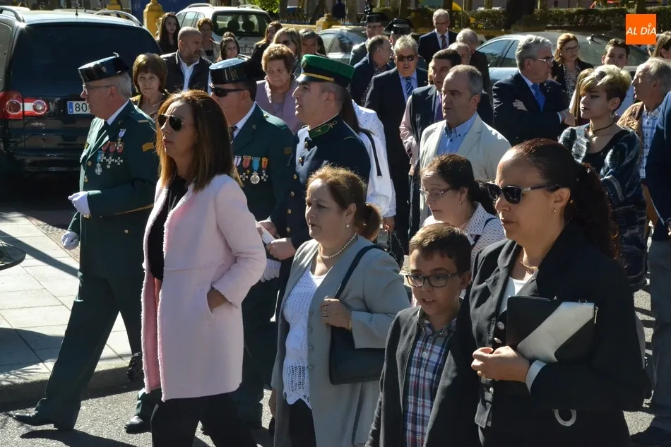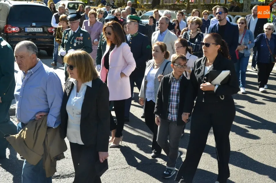Tras ello, tomó la palabra el párroco de San Cristóbal, Rafael Caño, quién dirigió una oración y la interpretación por parte de una serie de fieles del Himno de la Virgen del Pilar. Finalizado el acto en el Cuartel, llegó la hora de procesionar la imagen de la Virgen, que como es tradición fue portada durante la mayor parte del recorrido por mujeres familiares de agentes. La procesión, en una mañana soleada y con buena temperatura, transcurrió por las calles Laguna, Lorenza Iglesias y San Cristóbal en dirección a la Parroquia homónima.