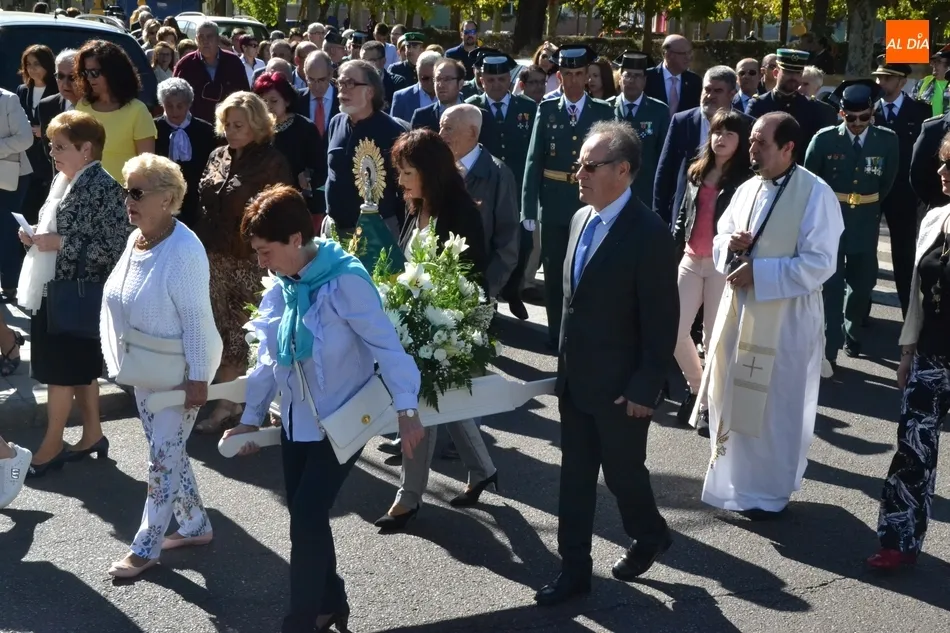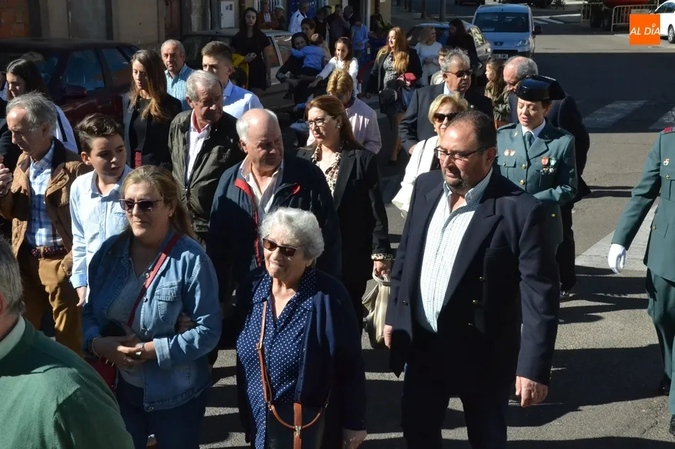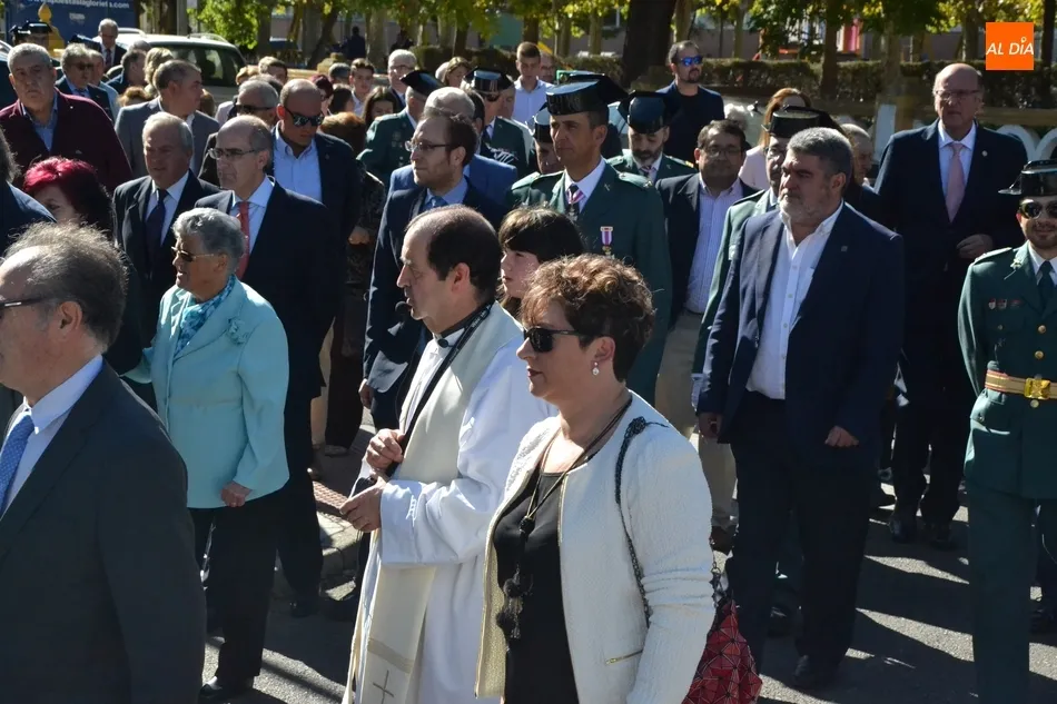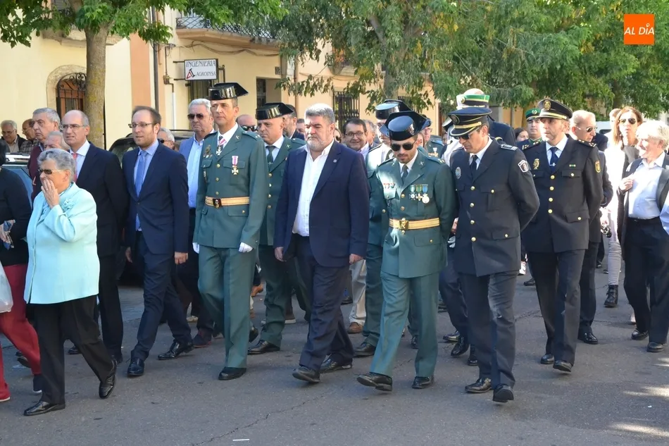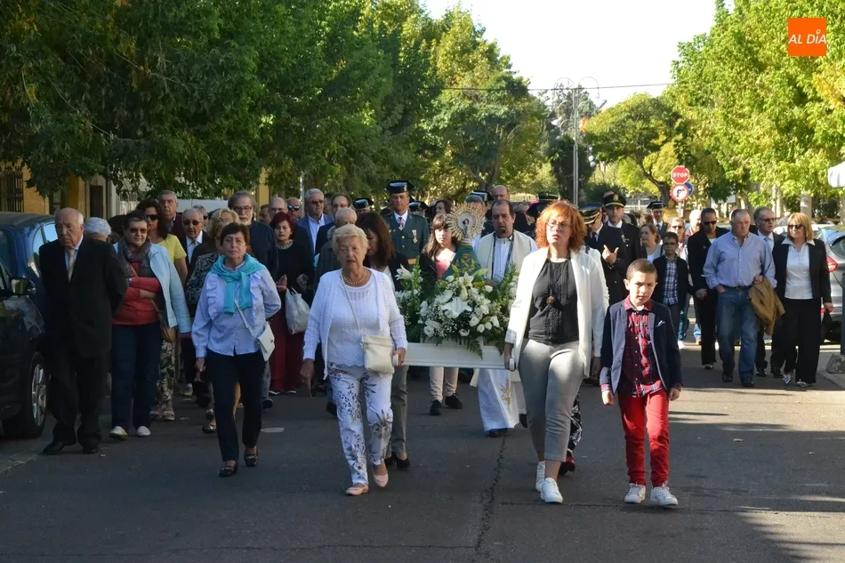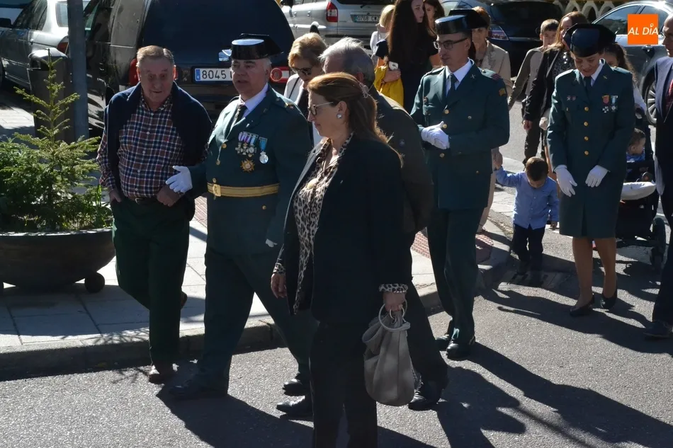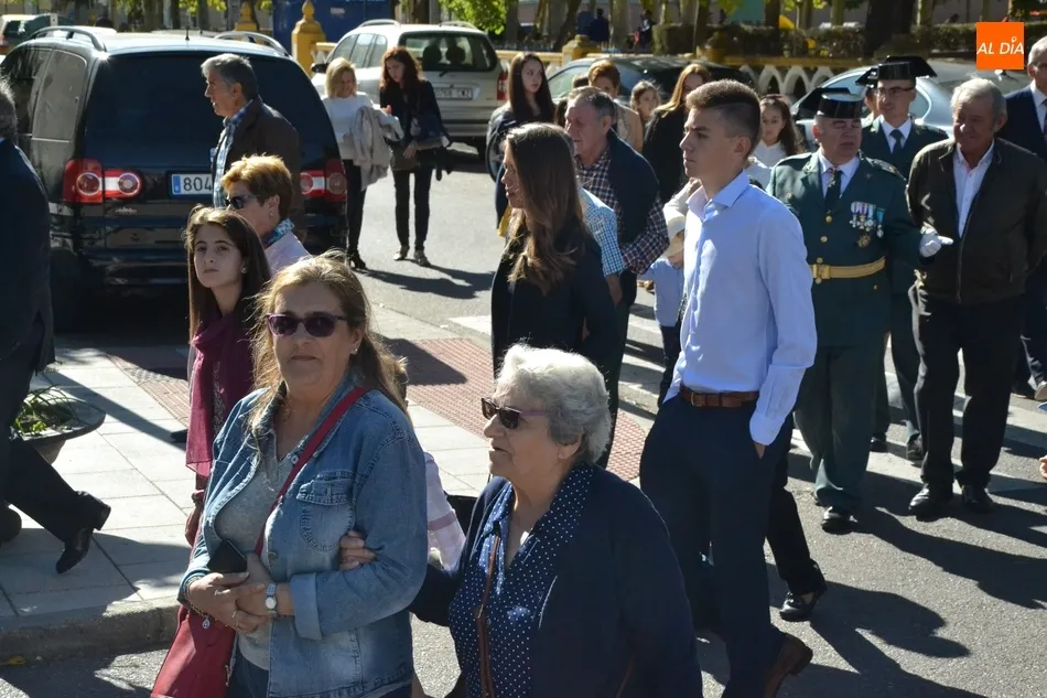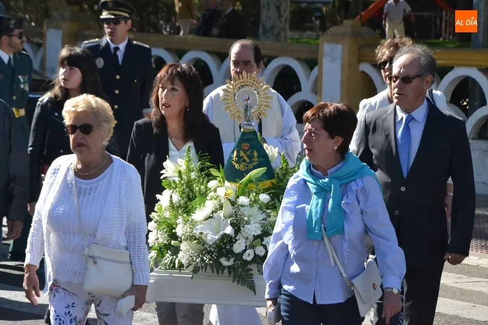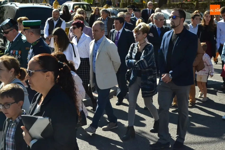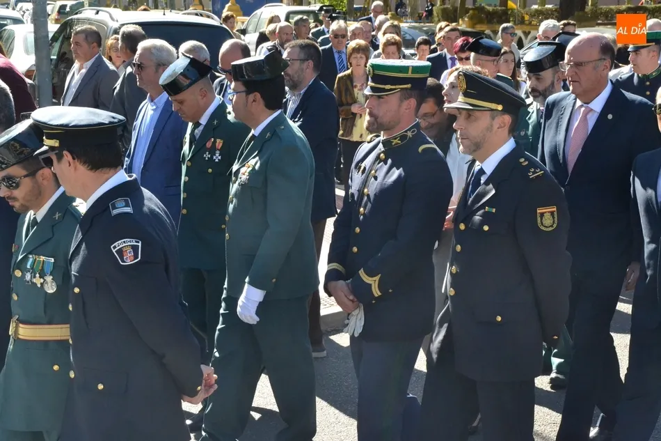 Tras ello, tomó la palabra el párroco de San Cristóbal, Rafael Caño, quién dirigió una oración y la interpretación por parte de una serie de fieles del Himno de la Virgen del Pilar. Finalizado el acto en el Cuartel, llegó la hora de procesionar la imagen de la Virgen, que como es tradición fue portada durante la mayor parte del recorrido por mujeres familiares de agentes. La procesión, en una mañana soleada y con buena temperatura, transcurrió por las calles Laguna, Lorenza Iglesias y San Cristóbal en dirección a la Parroquia homónima.