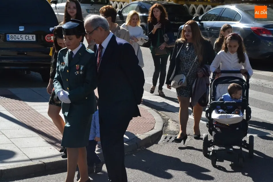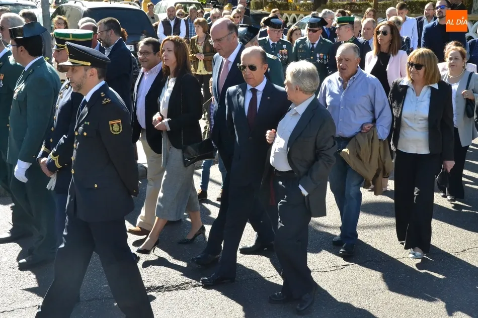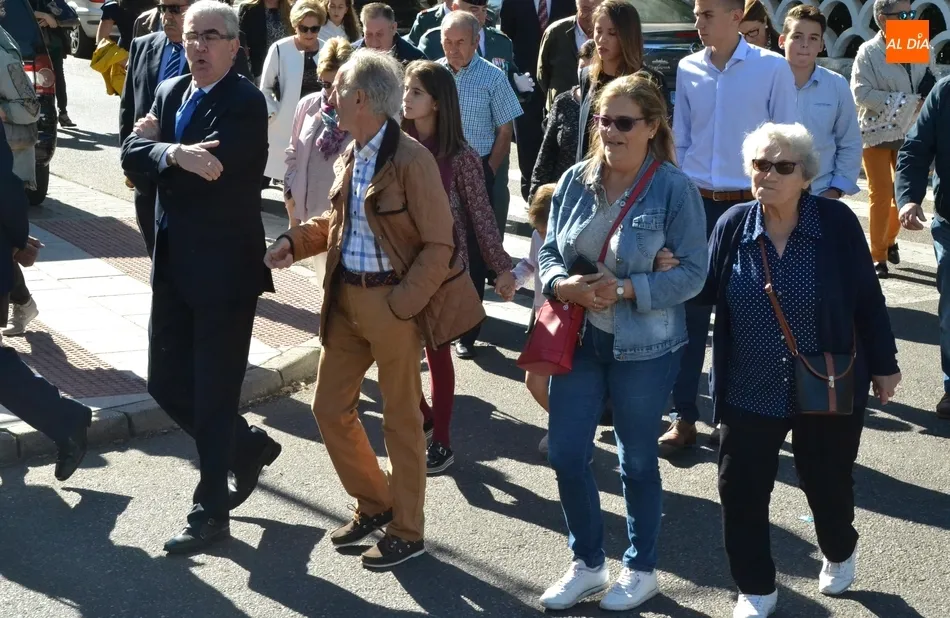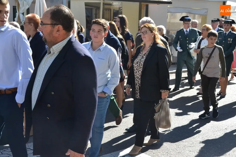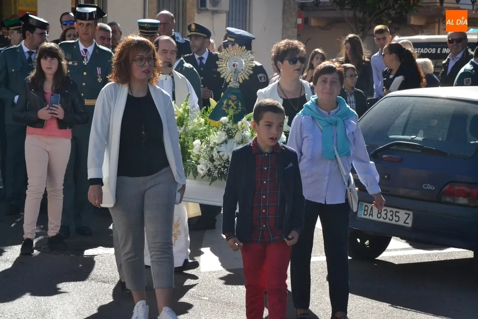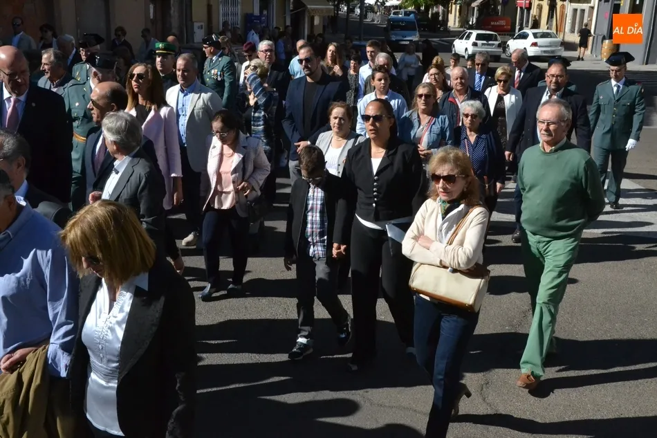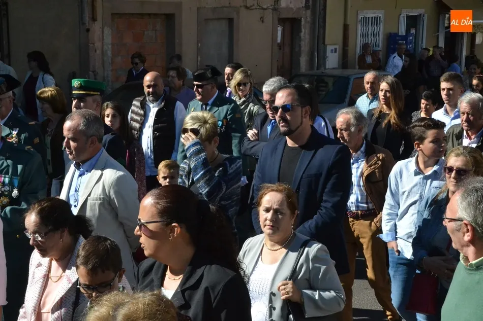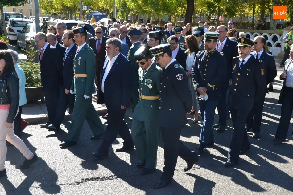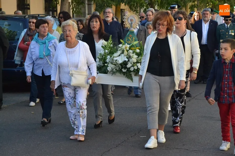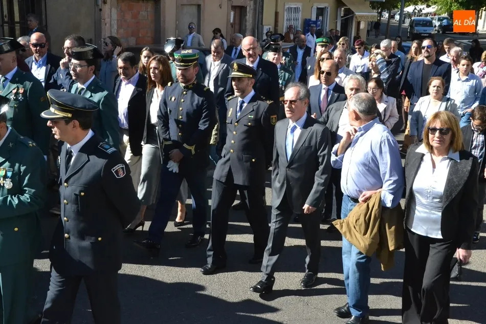 Tras ello, tomó la palabra el párroco de San Cristóbal, Rafael Caño, quién dirigió una oración y la interpretación por parte de una serie de fieles del Himno de la Virgen del Pilar. Finalizado el acto en el Cuartel, llegó la hora de procesionar la imagen de la Virgen, que como es tradición fue portada durante la mayor parte del recorrido por mujeres familiares de agentes. La procesión, en una mañana soleada y con buena temperatura, transcurrió por las calles Laguna, Lorenza Iglesias y San Cristóbal en dirección a la Parroquia homónima.