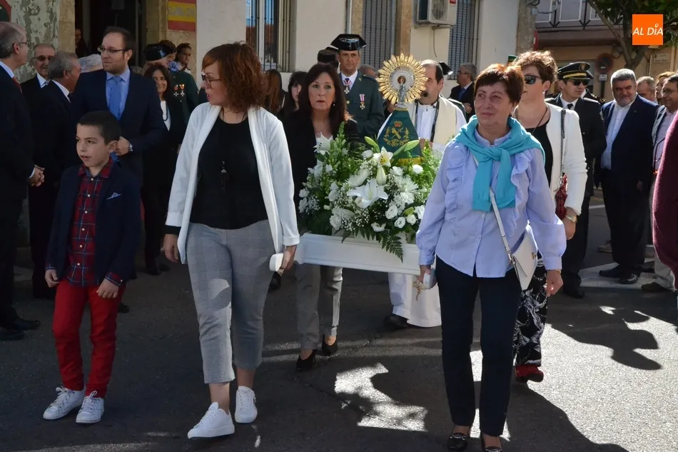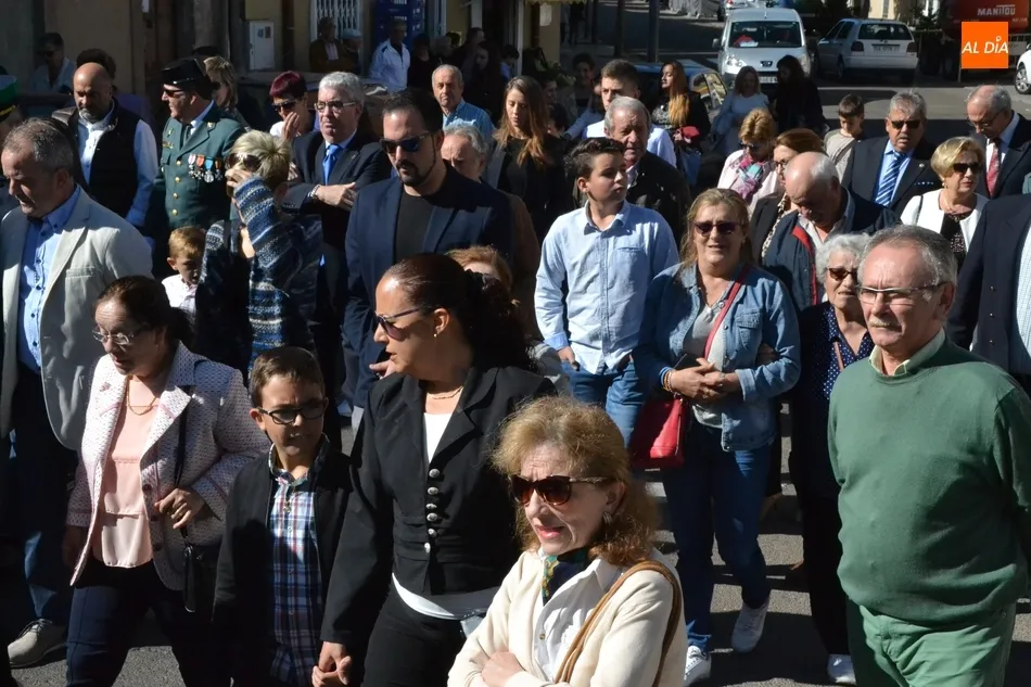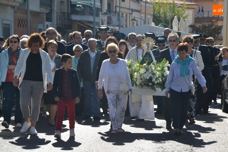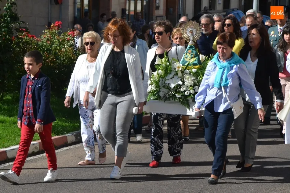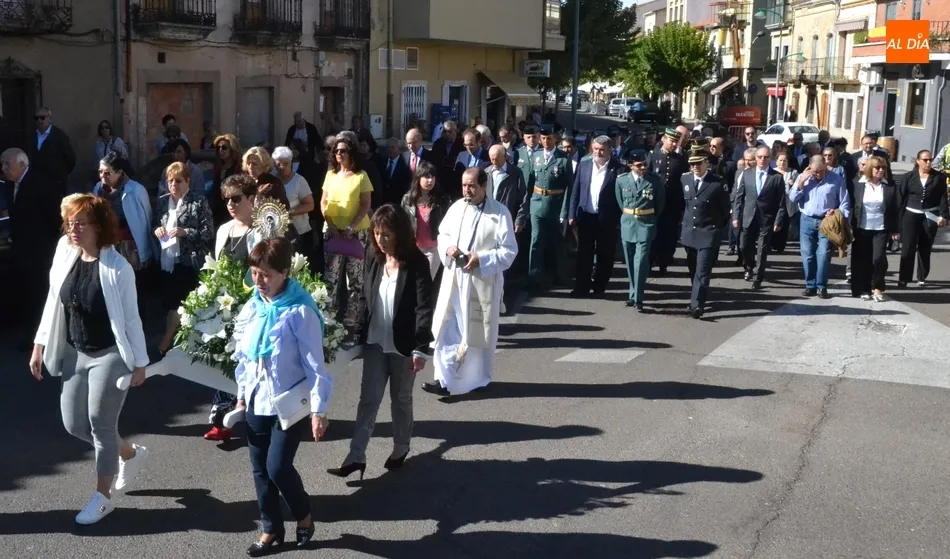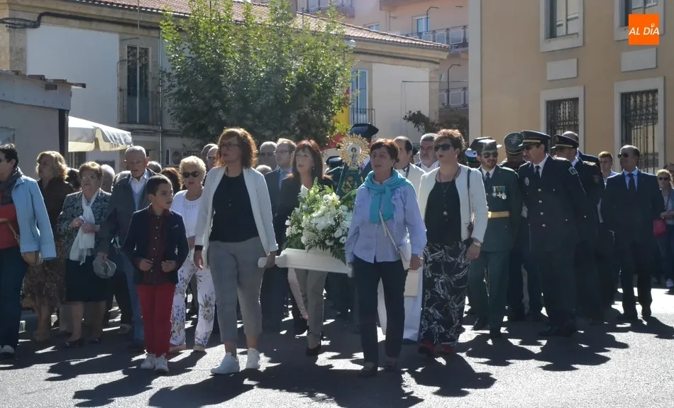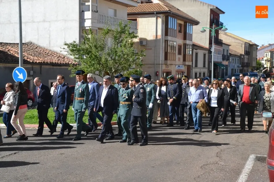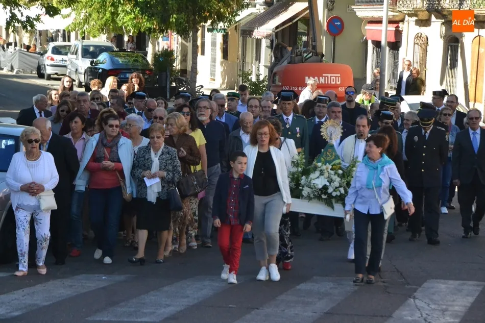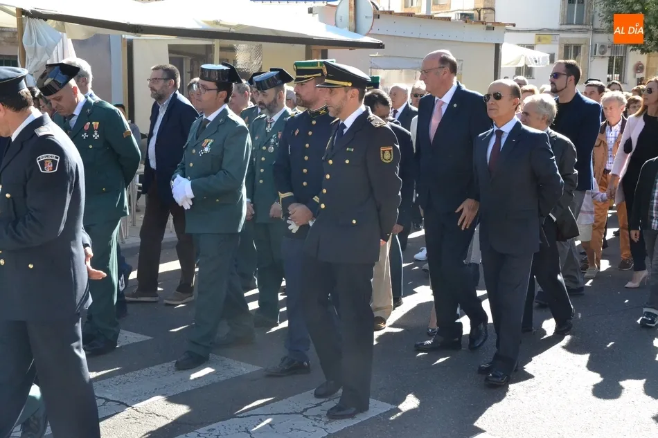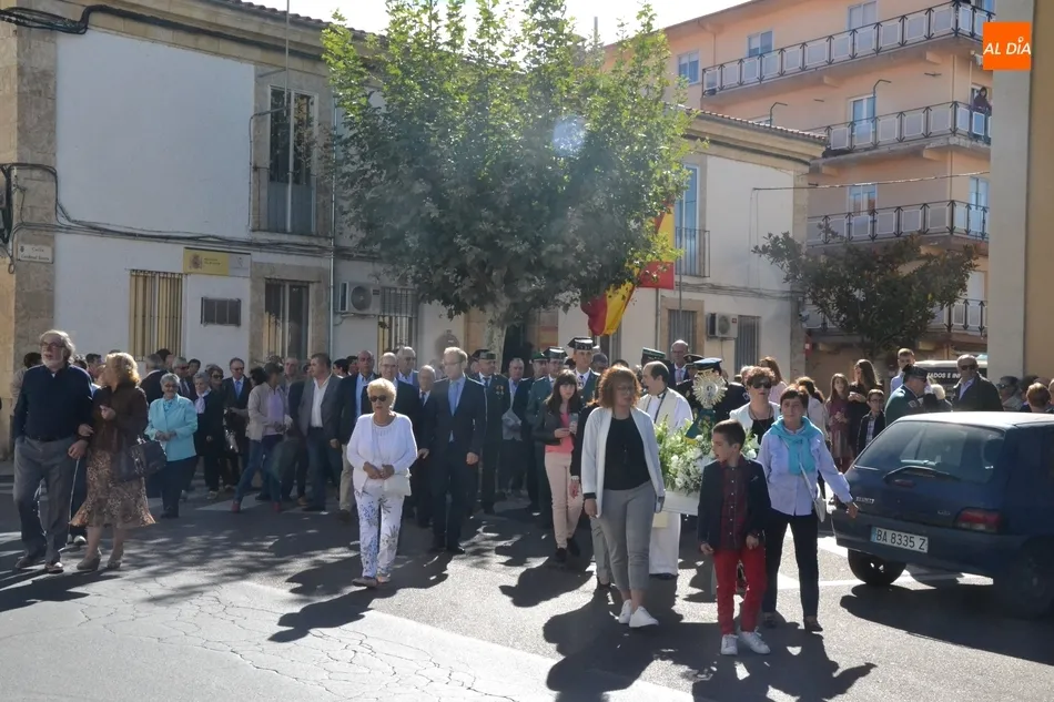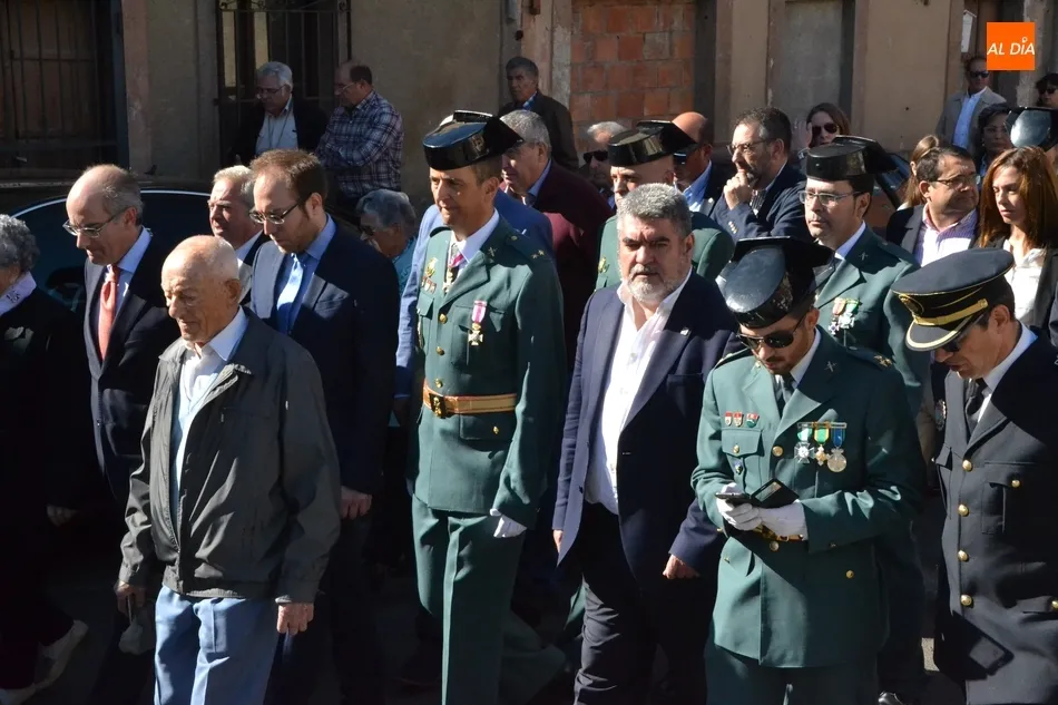Tras ello, tomó la palabra el párroco de San Cristóbal, Rafael Caño, quién dirigió una oración y la interpretación por parte de una serie de fieles del Himno de la Virgen del Pilar. Finalizado el acto en el Cuartel, llegó la hora de procesionar la imagen de la Virgen, que como es tradición fue portada durante la mayor parte del recorrido por mujeres familiares de agentes. La procesión, en una mañana soleada y con buena temperatura, transcurrió por las calles Laguna, Lorenza Iglesias y San Cristóbal en dirección a la Parroquia homónima.