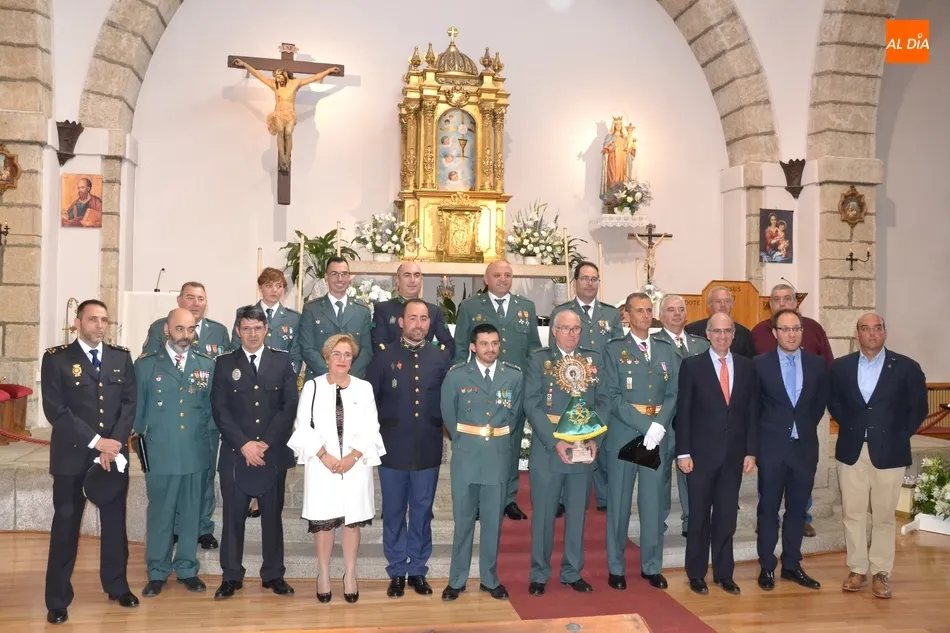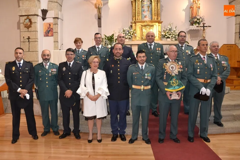 Concluida la misa, los agentes se realizaron una foto de familia con la imagen de la Virgen del Pilar en las escaleras del altar, antes de regresar junto a los invitados al Cuartel de la Guardia Civil para disfrutar de un convite.