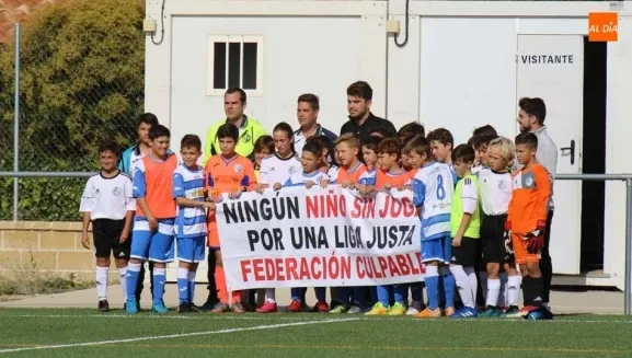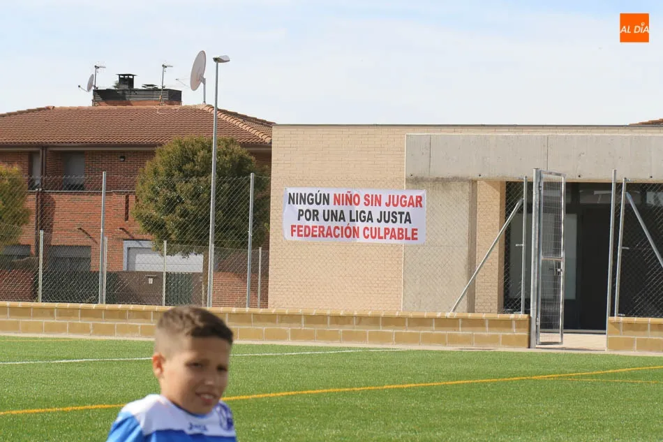 Continúa la polémica por la creación de un grupo en la Tercera División Alevín con únicamente tres equipos. Tras varias semanas y la promesa de que se solucionaría por parte de las autoridades, el asunto sigue igual y desde el cabrerizos enviaban el pasado viernes un comunicado a los medios donde cargaban duramente contra la Federación Territorial y la Delegación Salmantina. Esta mañana en los partidos de sus equipos lucían una pancarta al empezar donde abogaban por el derecho de los niños a jugar y hacerlo en una Liga justa y una competición digna.