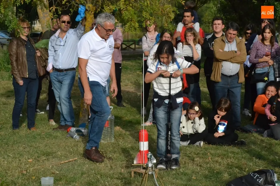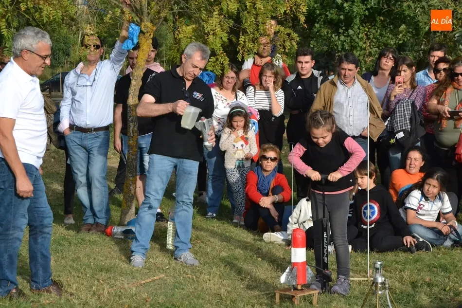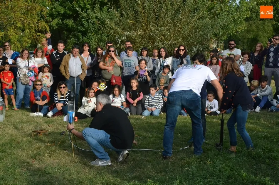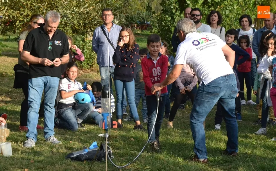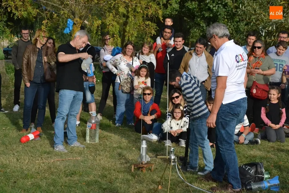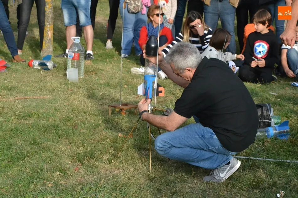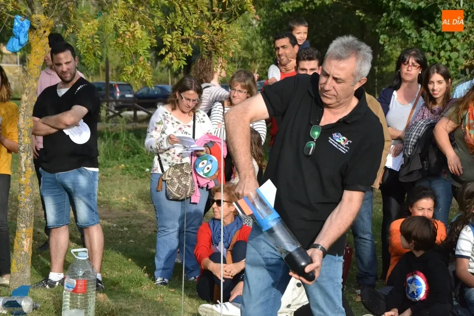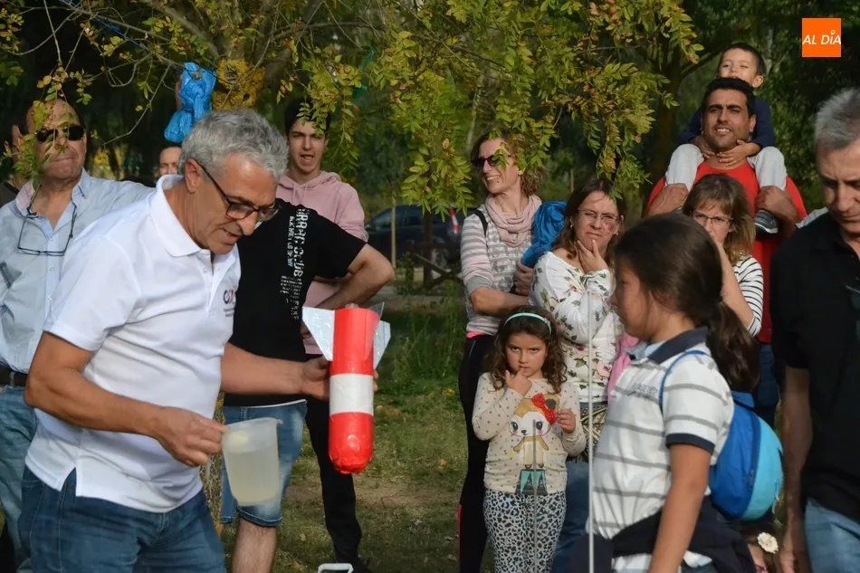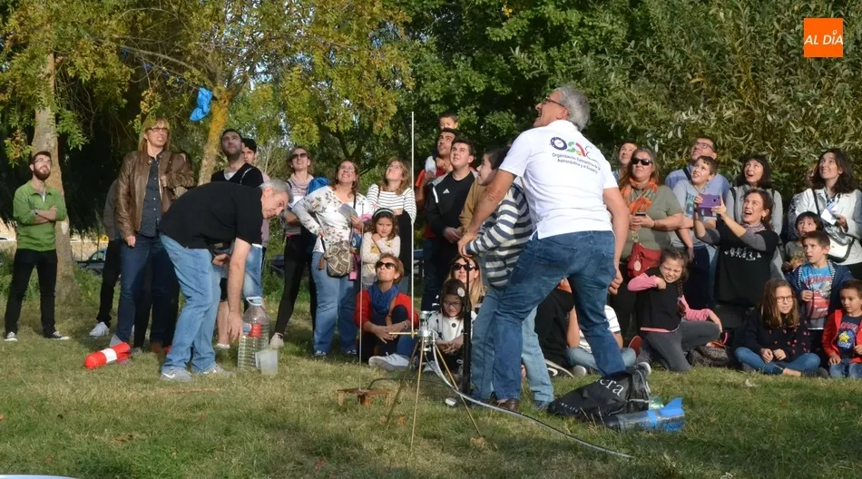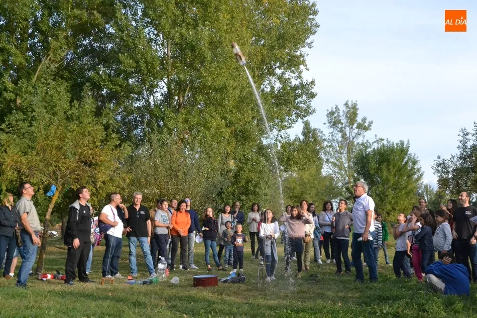 Al mismo tiempo que esto tenía lugar en el interior, en el exterior ya se pudieron realizar las primeras observaciones con telescopio del cielo. La gran actividad al aire libre fue el lanzamiento de varios cohetes de agua, construidos a partir de botellas de plástico. A esas botellas se les metió agua y posteriormente se les insufló aire a presión para realizar una serie de lanzamientos que suscitaron una notable expectación, sobre todo entre los niños, que se encargaron de propulsar los cohetes.