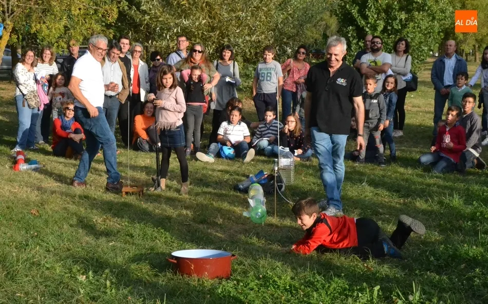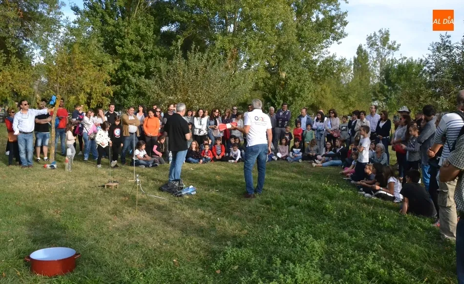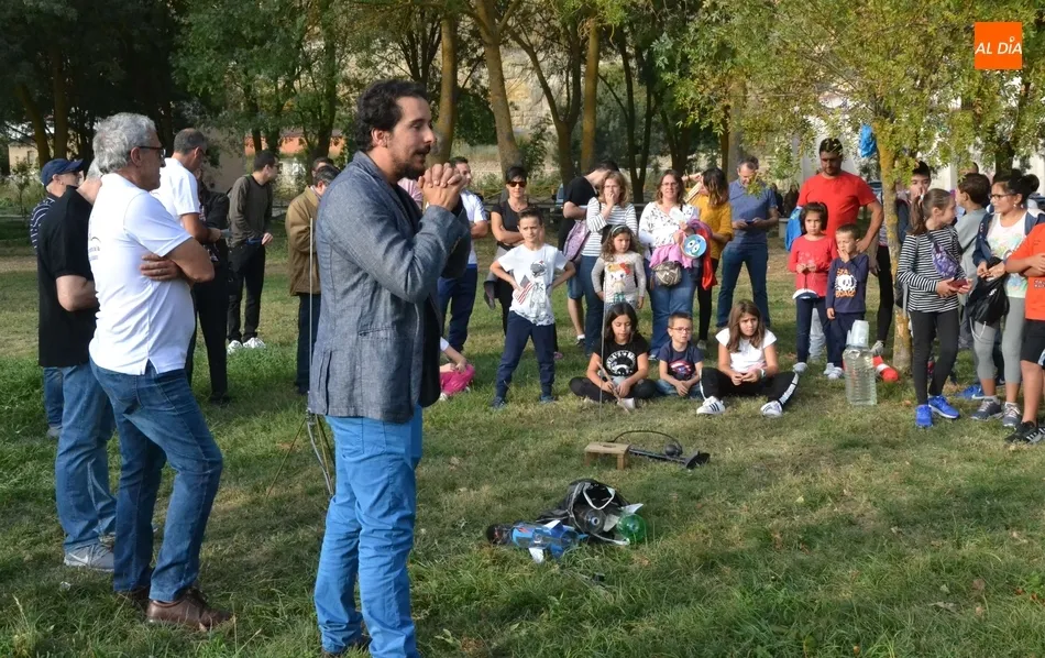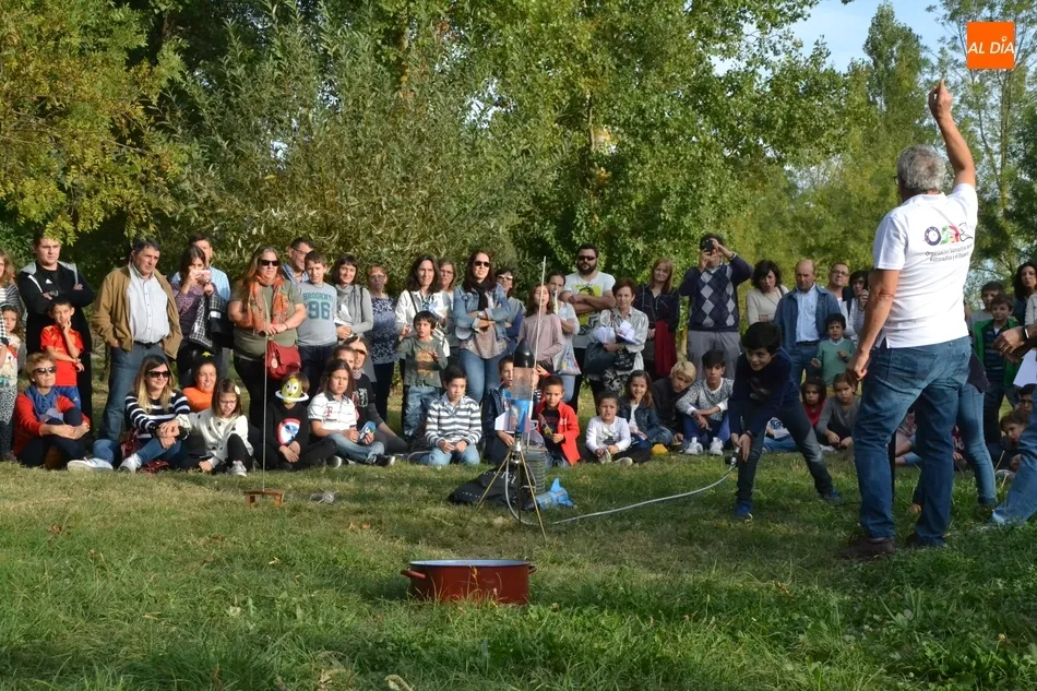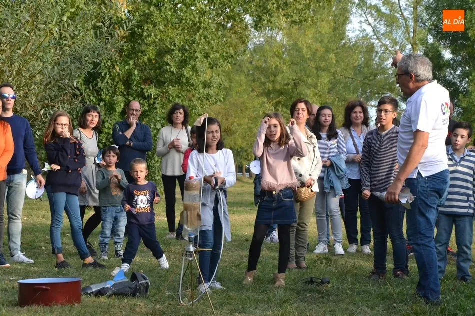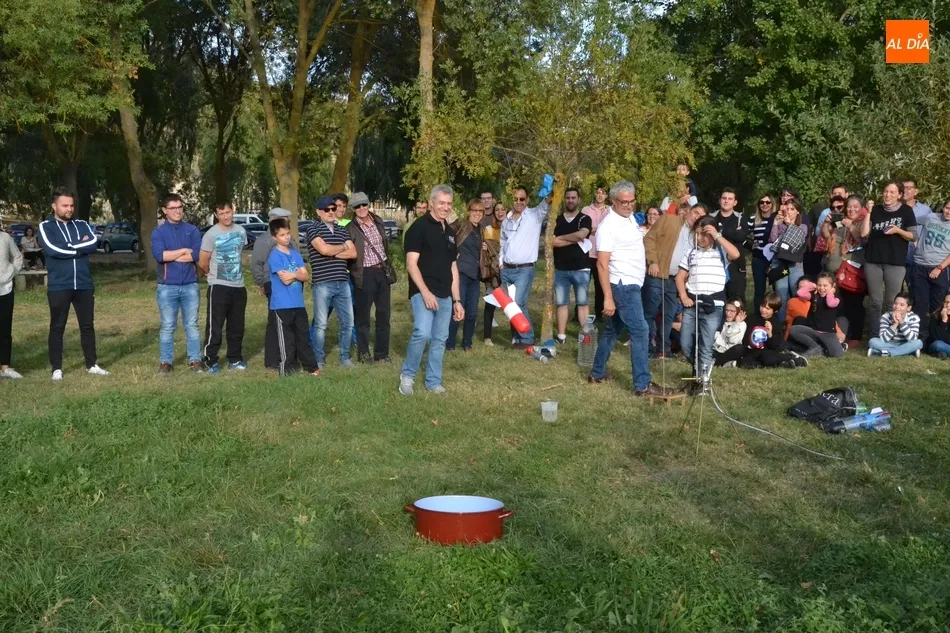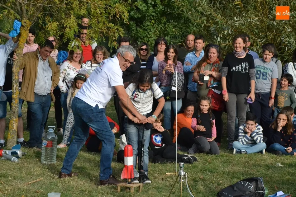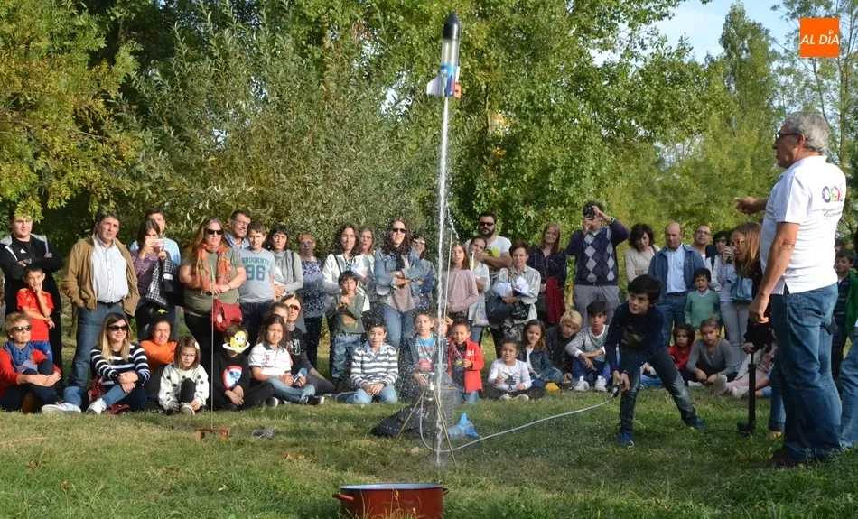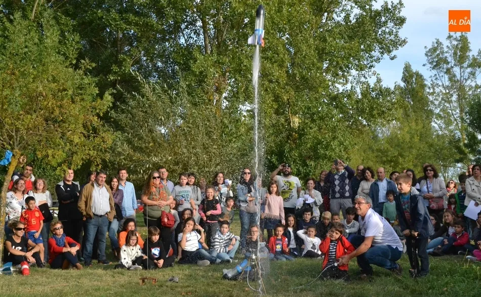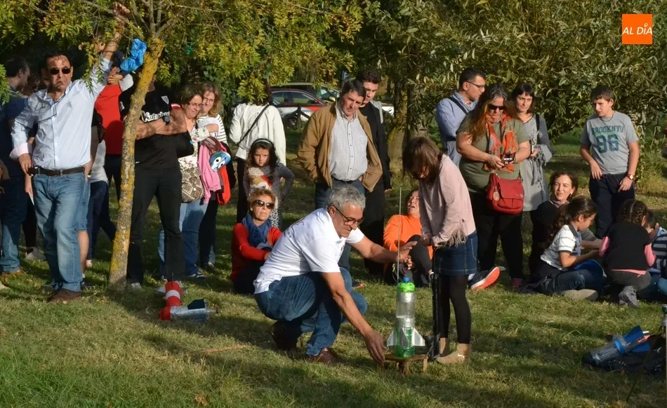 Al mismo tiempo que esto tenía lugar en el interior, en el exterior ya se pudieron realizar las primeras observaciones con telescopio del cielo. La gran actividad al aire libre fue el lanzamiento de varios cohetes de agua, construidos a partir de botellas de plástico. A esas botellas se les metió agua y posteriormente se les insufló aire a presión para realizar una serie de lanzamientos que suscitaron una notable expectación, sobre todo entre los niños, que se encargaron de propulsar los cohetes.