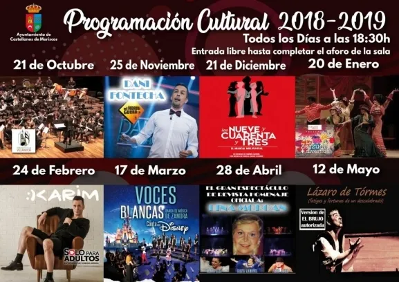 De esta forma, el próximo domingo, 21 de octubre, arrancará la programación con la actuación de la Banda de Música de Villamayor, que ofrecerá un concierto de música clásica e instrumental. Para el mes de noviembre, más concretamente el domingo 25, será Dani Fontecha, humorista que participa en el conocido programa televisivo ?El Hormiguero 3.0, quien traiga su show a Castellanos de Moriscos. Y para cerrar el año, el 21 de diciembre será turno del uno de los platos fuertes del programa: El Gran Musical ?Las Nueve y Cuarenta y Tres?, una producción divertida que sacará la sonrisa a los asistentes que acudan al Centro Polivalente San Roque.