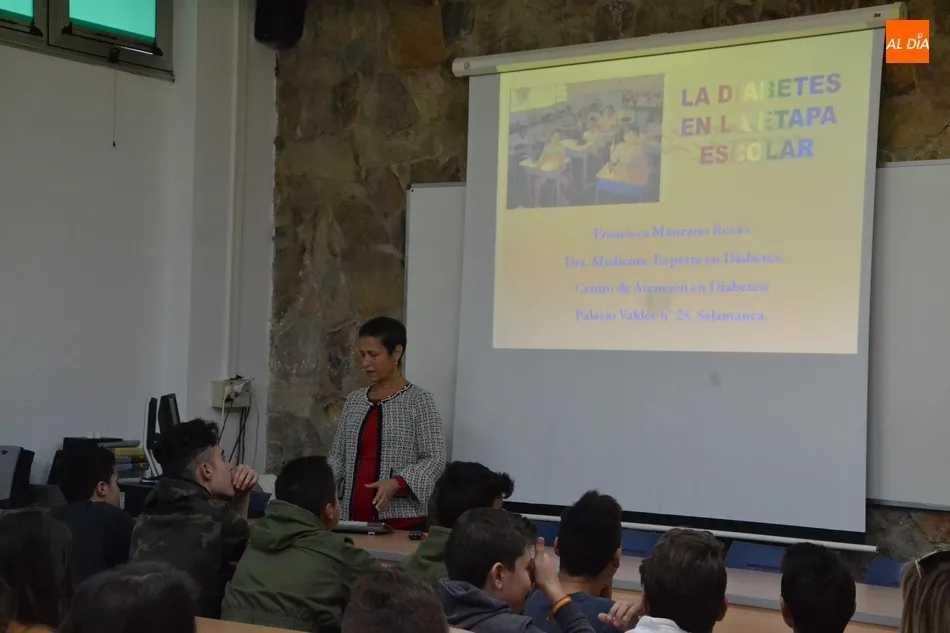 Estas charlas corren a cargo de la educadora diabetológica Francisca Manzano, que a lo largo de la mañana del lunes tuvo las tres primeras sesiones con los alumnos de 1º, 2º y 3º de la ESO. En la mañana del miércoles será turno para desarrollar estas sesiones con los alumnos de 4º de la ESO, y 1º y 2º de Bachillerato.