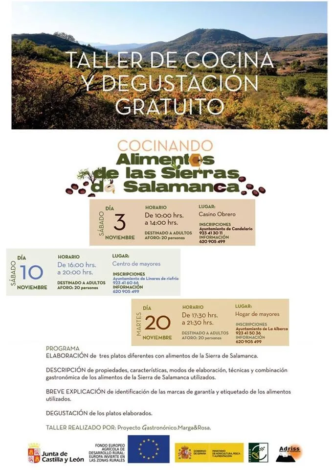 En cuanto a 'Cocinando alimentos de las Sierras de Salamanca', se trata de una propuesta que aúna gastronomía, promoción de productos locales y animación cultural en una sola actividad, ofreciendo unos novedosos talleres de cocina que se celebrarán a lo largo del mes. Cada jornada tendrá una duración de cuatro horas y estarán impartidas por la profesora Rosa Encinas y por Margarita Barrero, técnico superior de cocina. El contenido consiste en elaborar tres platos con alimentos de las Sierras de Salamanca. Se ofrecerá información sobre los productos, como características, técnicas gastronómicas y combinación entre ellos. Se explicará cómo identificar productos protegidos y una degustación con los platos cocinados.