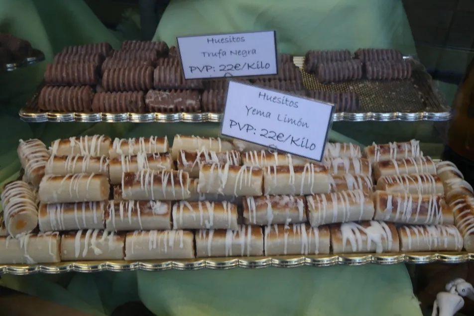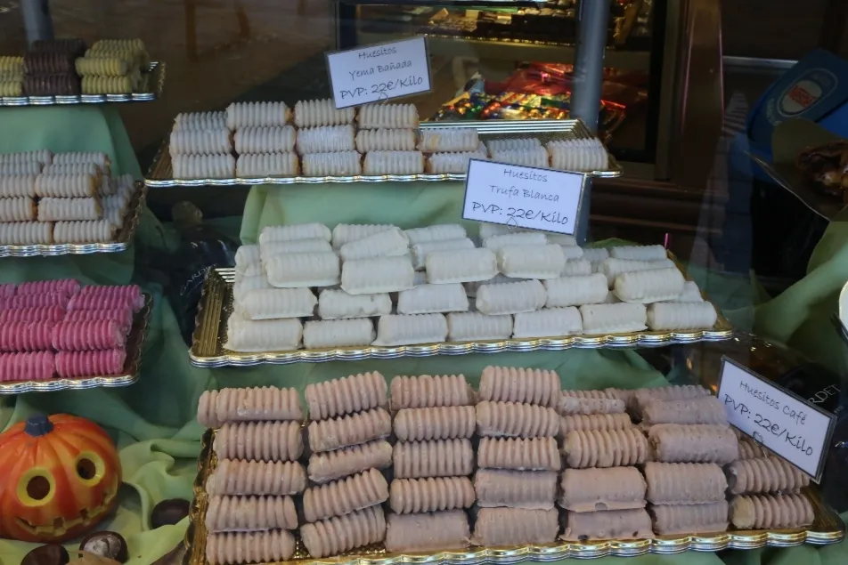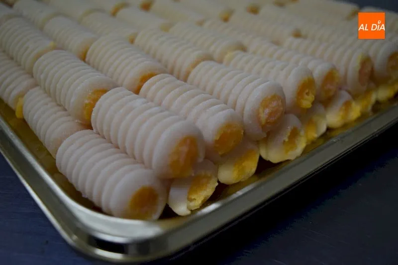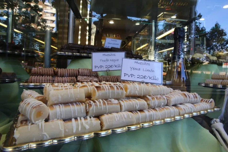 Además de los buñuelos y también los almendrados y empiñonados, los huesos de santo son otros de los productos más demandados en estos días, aunque no tienen la forma tradicional de un hueso, sino más bien de un cilindro que recuerda la tibia. Con un exterior de mazapán, su interior ha pasado de rellenarse simplemente de crema a hacerlo de sabores como limón, nata, trufa, frambuesa, yema, chocolate, fresa y naranja.