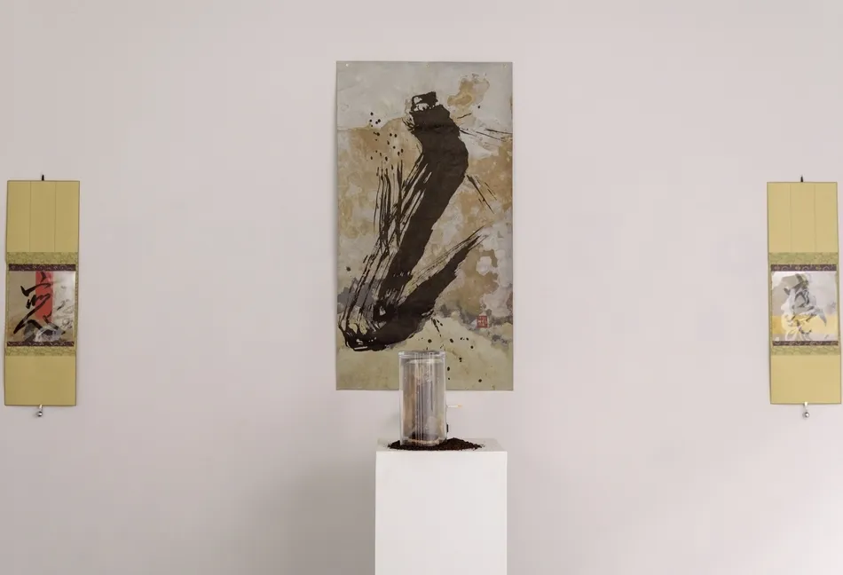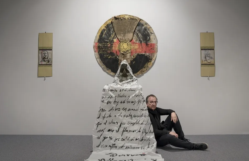 M.E.: Cada caligrafía es una palabra, un ideograma, lo que me fue sugiriendo la relectura de Dante. Es la caligrafía Shodo que suelo trabajar. Y no solo lo que dices de la materia es verdad, alguno de los cuadros tiene la huella de mis gatos que se pasean por él. Y uso, por ejemplo, las herramientas del campo no solo como soporte físico, sino metafórico. Si utilizo una criba abandonada, en el fondo es porque creo que tienes que pasar por la criba y quedarte solo con lo esencial de la vida, con el corazón. Por eso en este cuadro dividí los trozos de pizarra, los trozos del ideograma que representa a la palabra corazón y luego los cosí. Se trata de recrear el elemento y crear sobre ello.